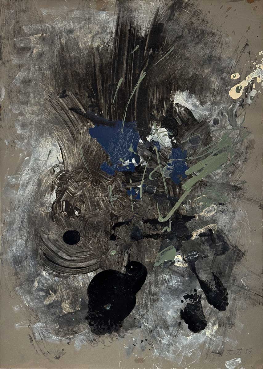 Diese frühe Komposition markiert einen entscheidenden Schritt in Albert Fürsts malerischer Entwicklung: Erstmals experimentiert er hier mit Lackfarben, deren glänzende, zähe Substanz neue Ausdrucksmöglichkeiten eröffnet. Auf einem grauen Grund entfaltet sich ein komplexes Geflecht aus Schwarz, Grün, Grau und tiefem Blau, durchsetzt von gestischen Spuren, Kratzungen und Verdichtungen.