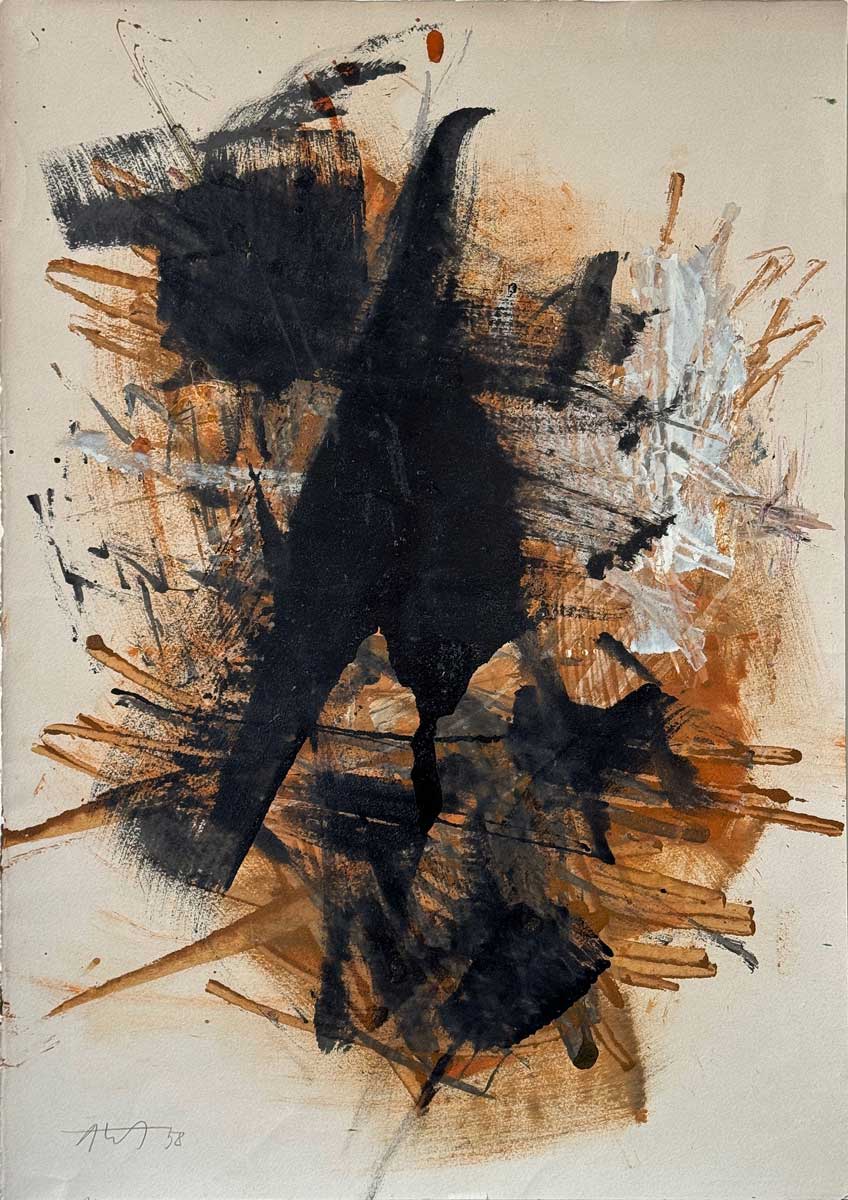 Diese frühe Arbeit von 1957 gehört zu den Schlüsselmomenten im Übergang von Albert Fürsts gegenständlicher Malerei hin zum Informel. Auf hellem Grund entfaltet sich eine dynamische, nahezu eruptive Komposition aus Schwarz, Ocker und Weiß, die noch Spuren figuraler Assoziationen erkennen lässt, zugleich aber bereits den Impuls der reinen Geste in sich trägt.