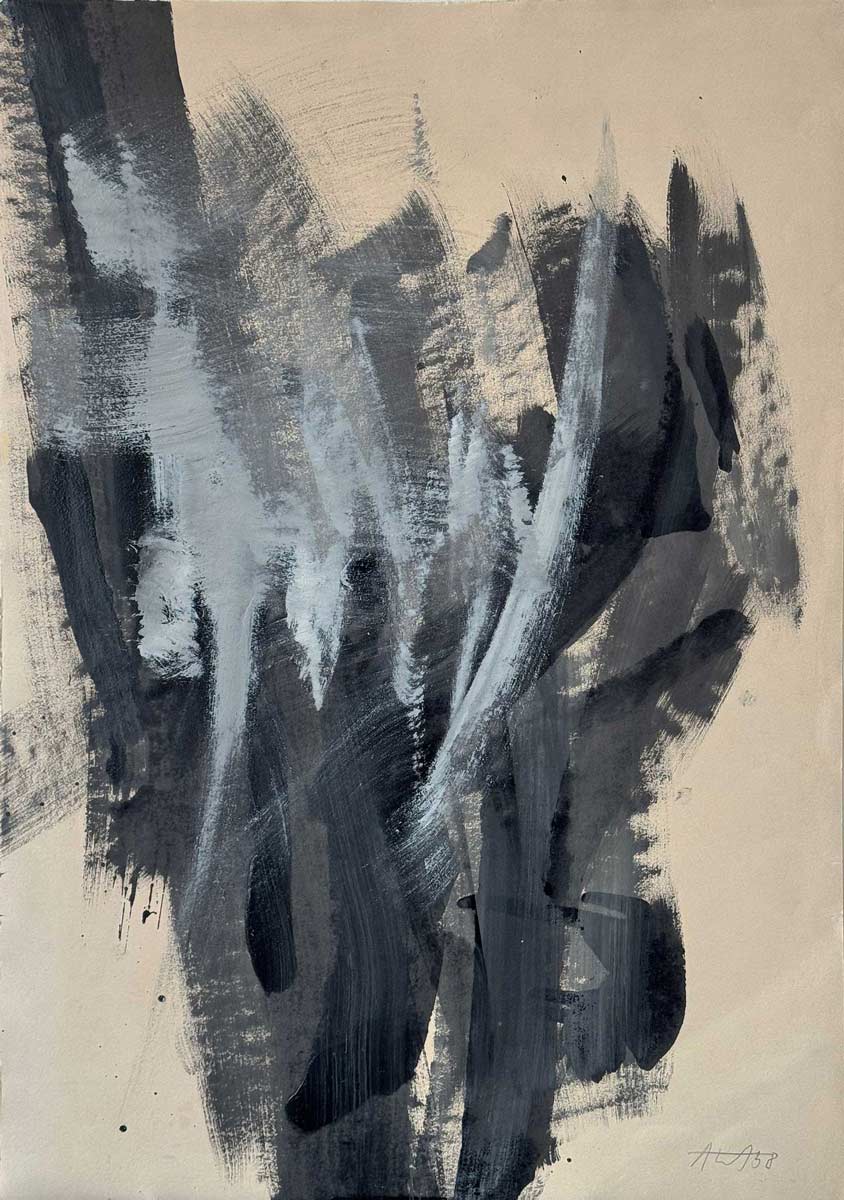In dieser Arbeit von 1958 verdichtet Albert Fürst seine Malweise zu einem rhythmischen Spiel aus vertikalen Schwüngen und weichen Überlagerungen in Grau und Schwarz. Die Bewegung entfaltet sich in pulsierenden Schichtungen, deren Transparenz den Blick in die Tiefe der Fläche zieht. Das Licht scheint sich nicht auf der Oberfläche zu spiegeln, sondern aus ihr heraus zu entstehen – als leiser Widerhall der Bewegung.