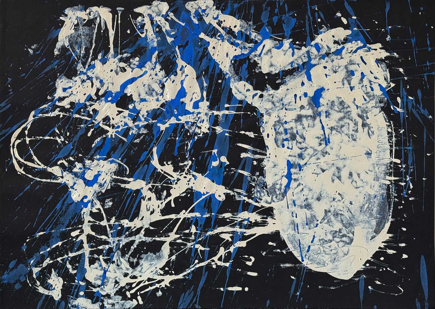In den beiden Papierarbeiten von 1963 verdichtet Albert Fürst die malerische Freiheit des Informel zu einer radikalen, fast musikalischen Sprache aus Bewegung und Kontrast. Das Schwarz des Bildgrunds wird zum Resonanzraum für ein dynamisches Geflecht aus Weiß und tiefem Ultramarinblau. Die Farbe ist nicht mehr gesetzt, sondern geworfen, geschleudert, getropft – sie entsteht im Moment der Bewegung. So verwandelt sich das Bildfeld in eine Bühne der Energie, in der sich spontane Geste und bewusste Struktur zu einem vibrierenden Gleichgewicht finden.