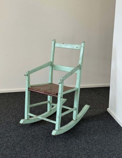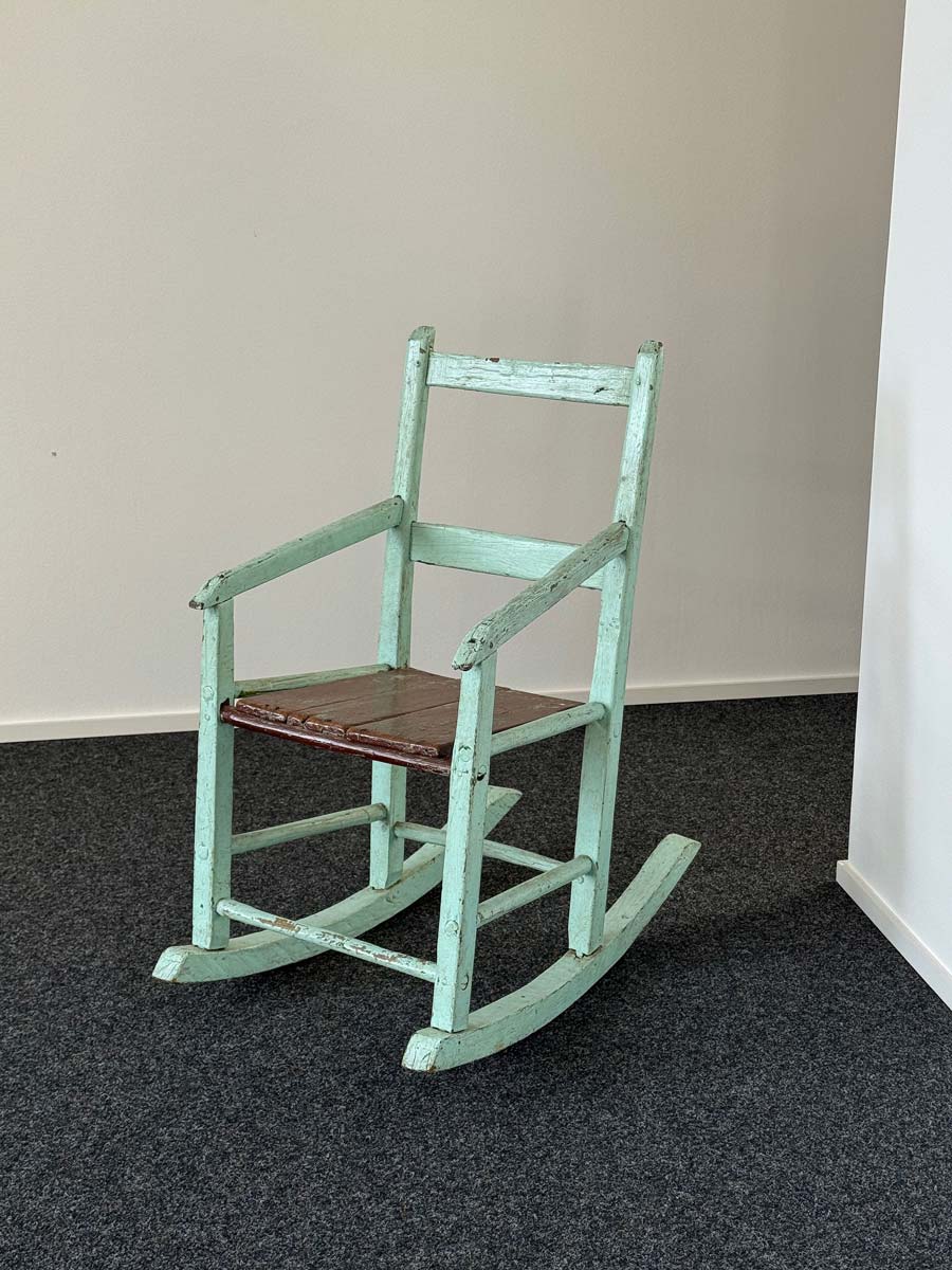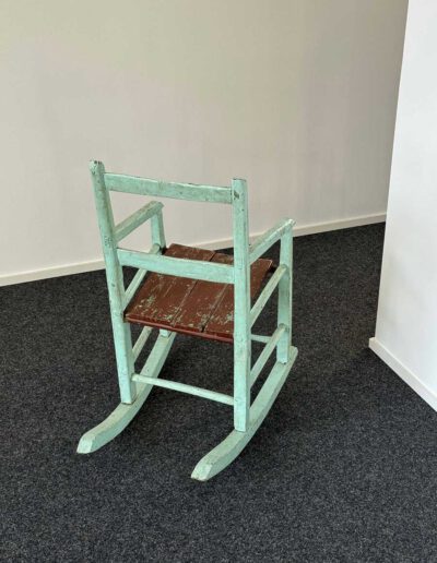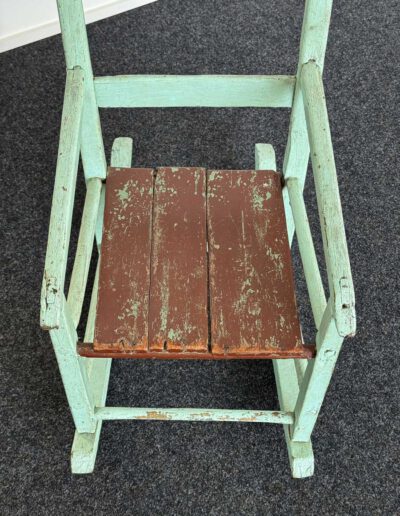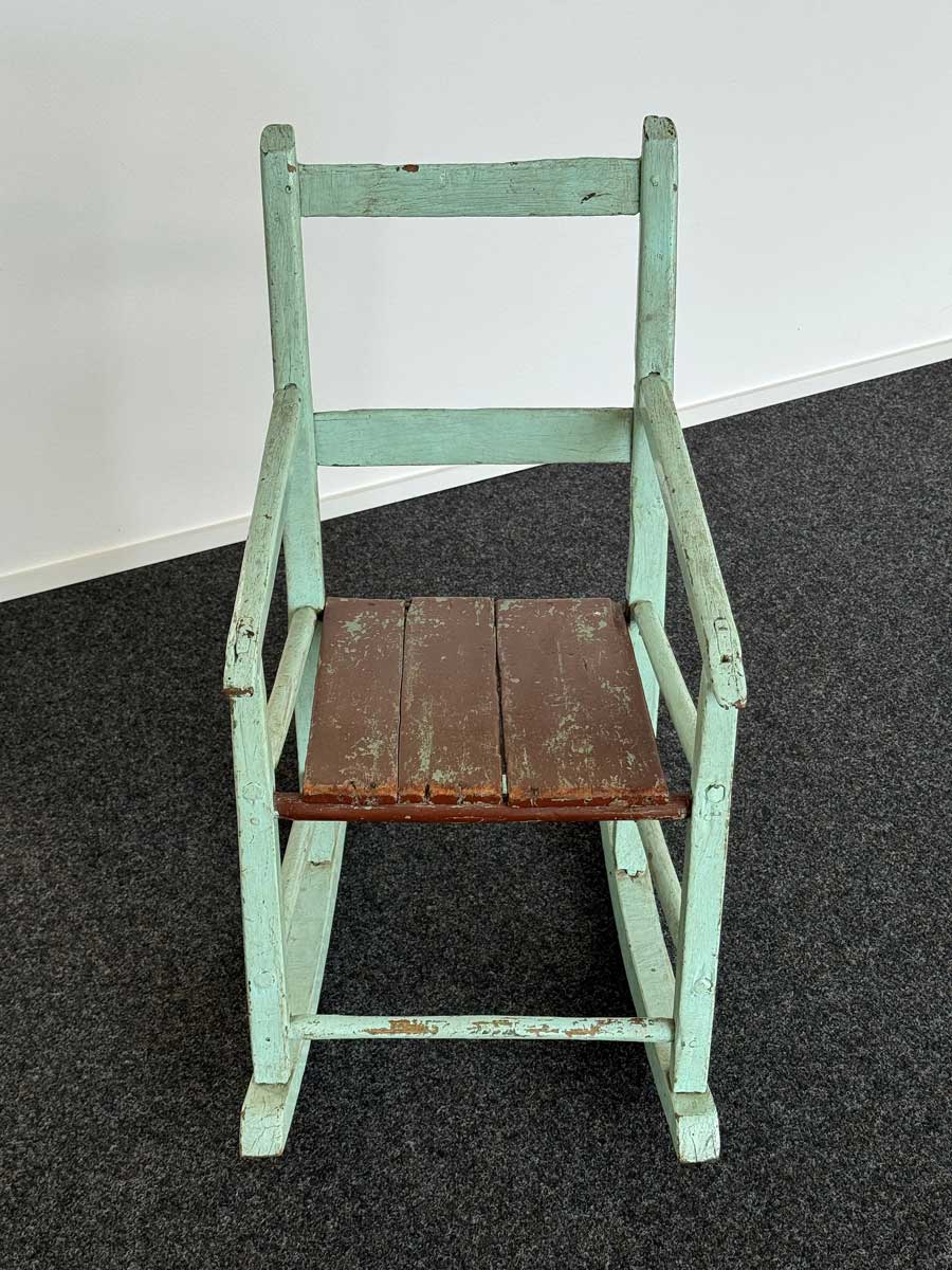 Auf gebogenen Kufen steht der schlichte Kinderstuhl mit seitlichen Armlehnen und eingesetzter Sitzfläche aus drei Latten. Die klare Rahmenkonstruktion ist vollständig gezapft und gesteckt; Nägel wurden ausschließlich zur Befestigung der Sitzlatten verwendet. Das Gestell ist aus Eiche gearbeitet und trägt eine alte, authentisch erhaltene Farbfassung in hellem Mintgrün, während die Sitzfläche rot überstrichen wurde.
