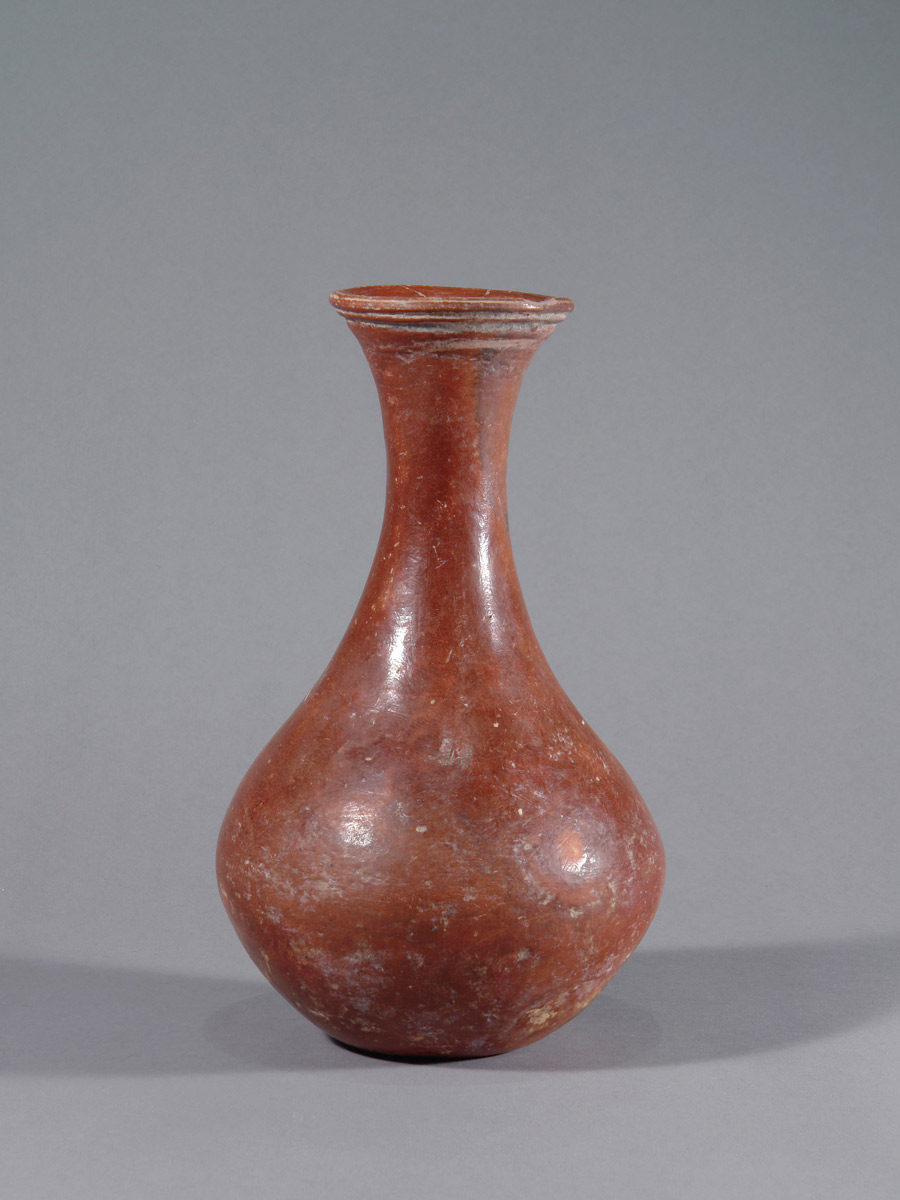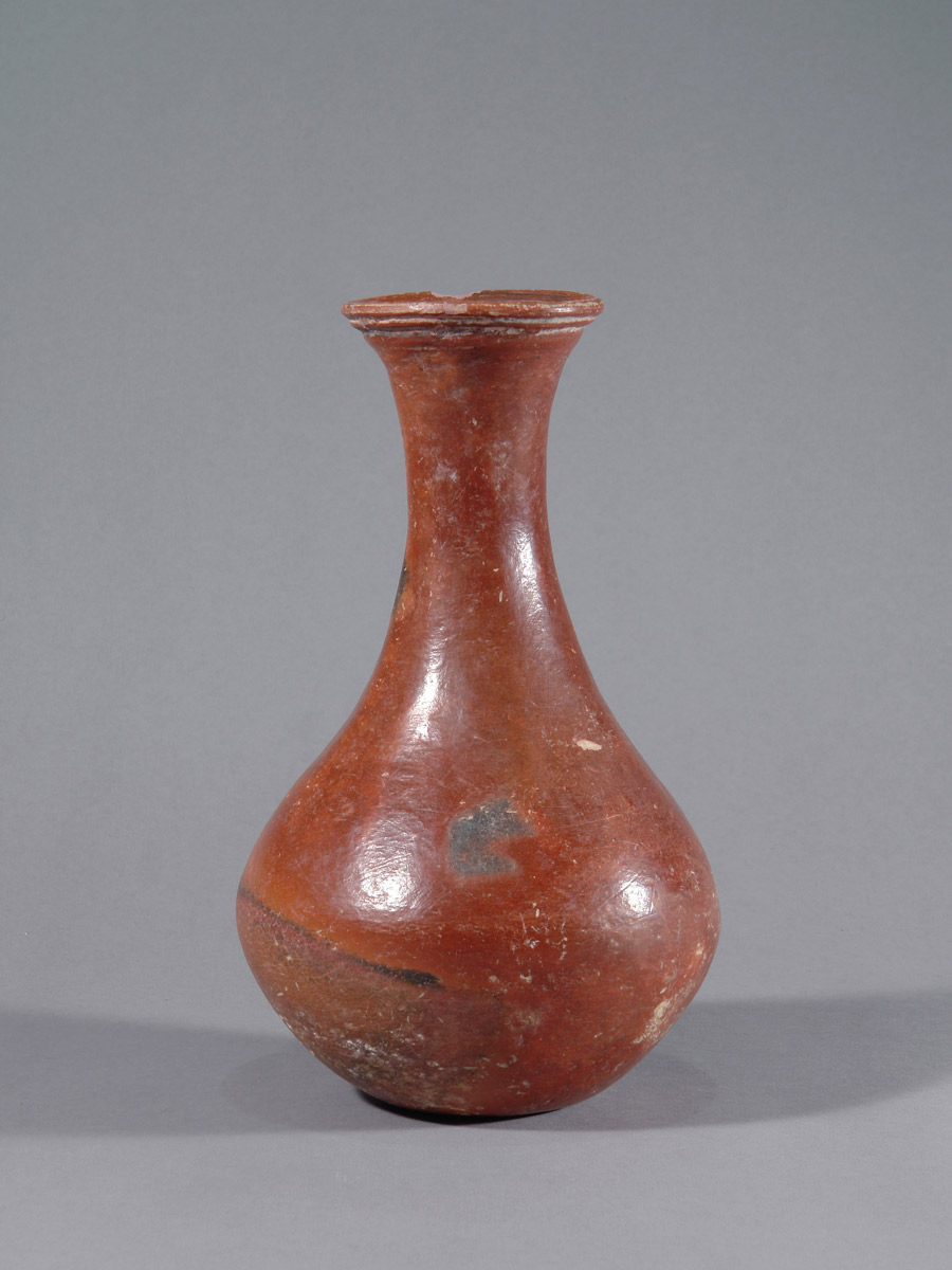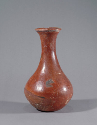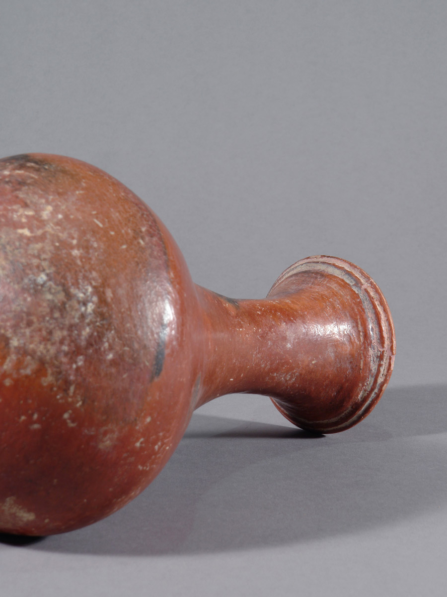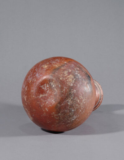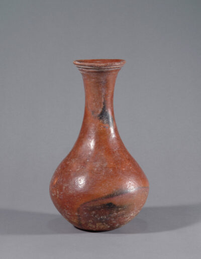 Dieses kleinere Terrakottagefäß überzeugt durch seine ausgewogene Form und die markanten Brandspuren, die der Oberfläche eine lebendige Präsenz verleihen. Mit einer Höhe von 23,5 cm ist es insgesamt sehr gut erhalten; es weist eine Fehlstelle am Rand sowie eine separate, fachgerecht ausgeführte Restaurierung auf. Die warmen, rötlich-braunen Farbtöne und die sichtbaren Spuren des Brennvorgangs unterstreichen den authentischen Charakter des Stücks. Die Oberfläche wurde vor dem Brand geglättet und verdichtet, eine in der Djenné-Region belegte Technik, die zu der geschlossenen, leicht schimmernden Oberfläche beigetragen hat.