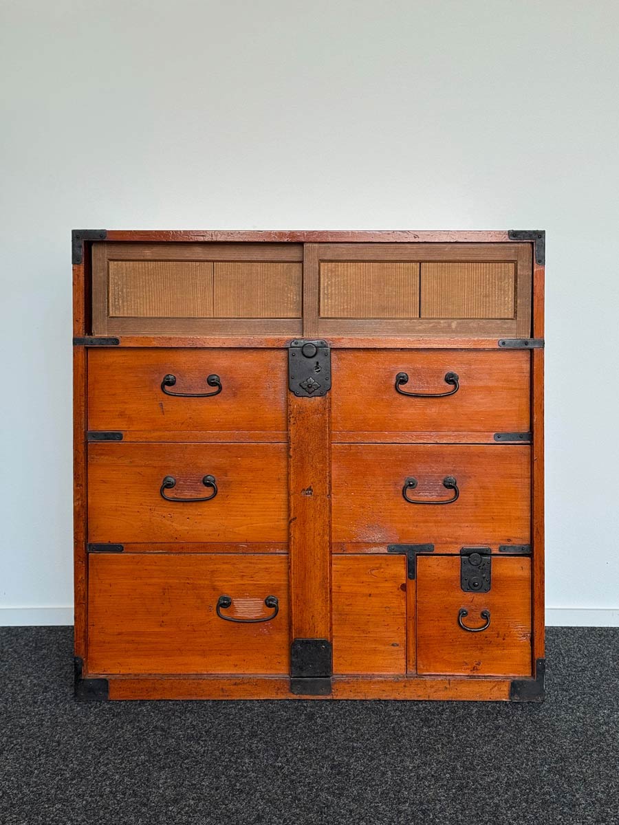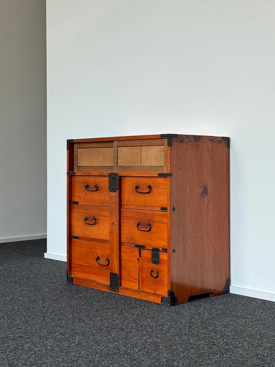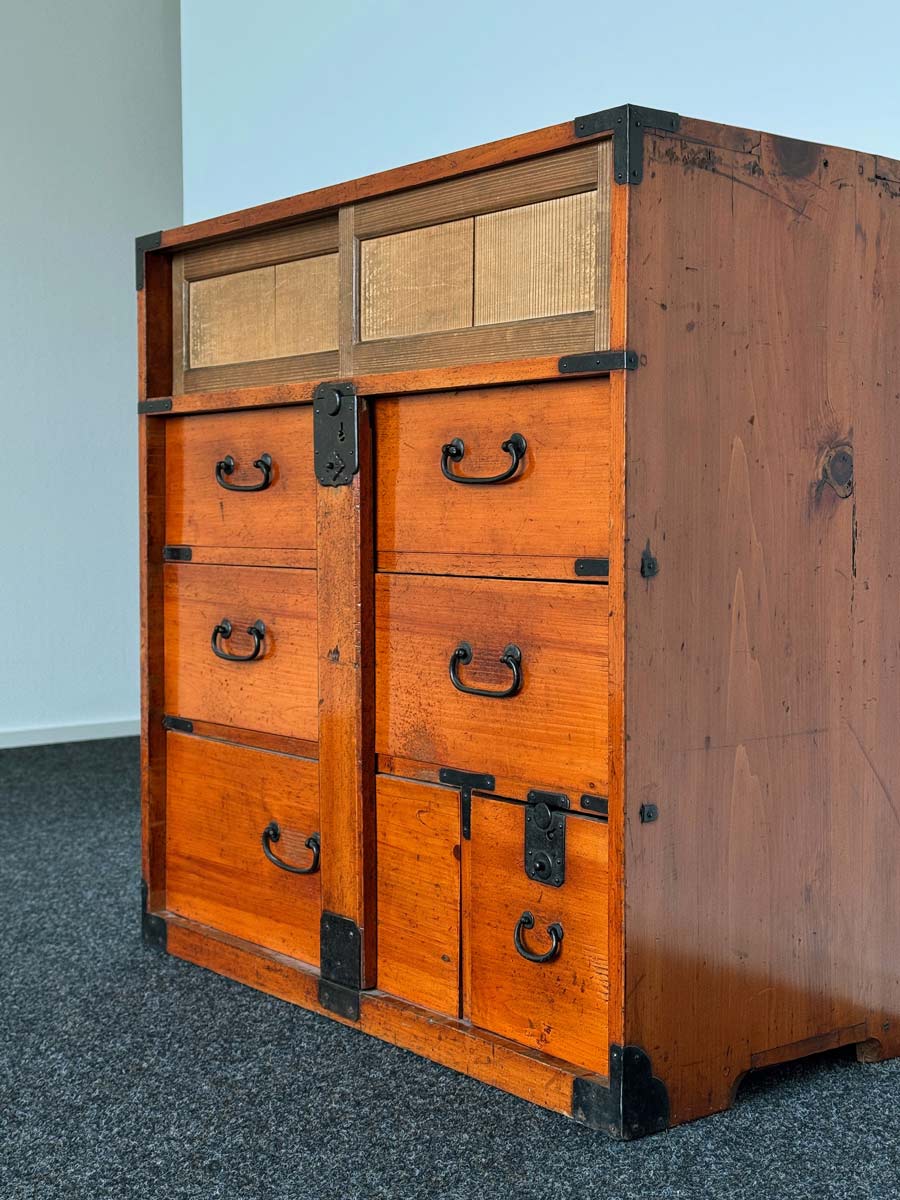 Dieser Tansu stammt aus dem späten 19. Jahrhundert. Sein kompakter Korpus ist klar proportioniert und streng gegliedert. Die Front zeigt eine ausgewogene Abfolge unterschiedlich großer Schubladen sowie ein kleines, verschließbares Fach. Die beiden oberen Schiebetüren sind im ursprünglichen Rohzustand belassen und setzen einen bewussten materiellen Kontrast zur gefassten Oberfläche des Korpus. Dessen Holz besitzt eine warme, durch Jahrzehnte gewachsene Oberfläche mit einem feinen Glanz von Urushi-Lack. Die Eisenbeschläge sind schlicht ausgeführt und von gleichmäßiger, dunkler Patina. Der Tansu hat sich in vollständig erhaltenem Zustand bewahrt, einschließlich des originalen vertikalen Riegels, der den unteren Bereich verschliesst und bei vergleichbaren Stücken häufig verloren ist.