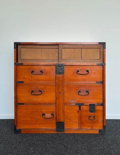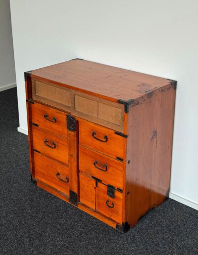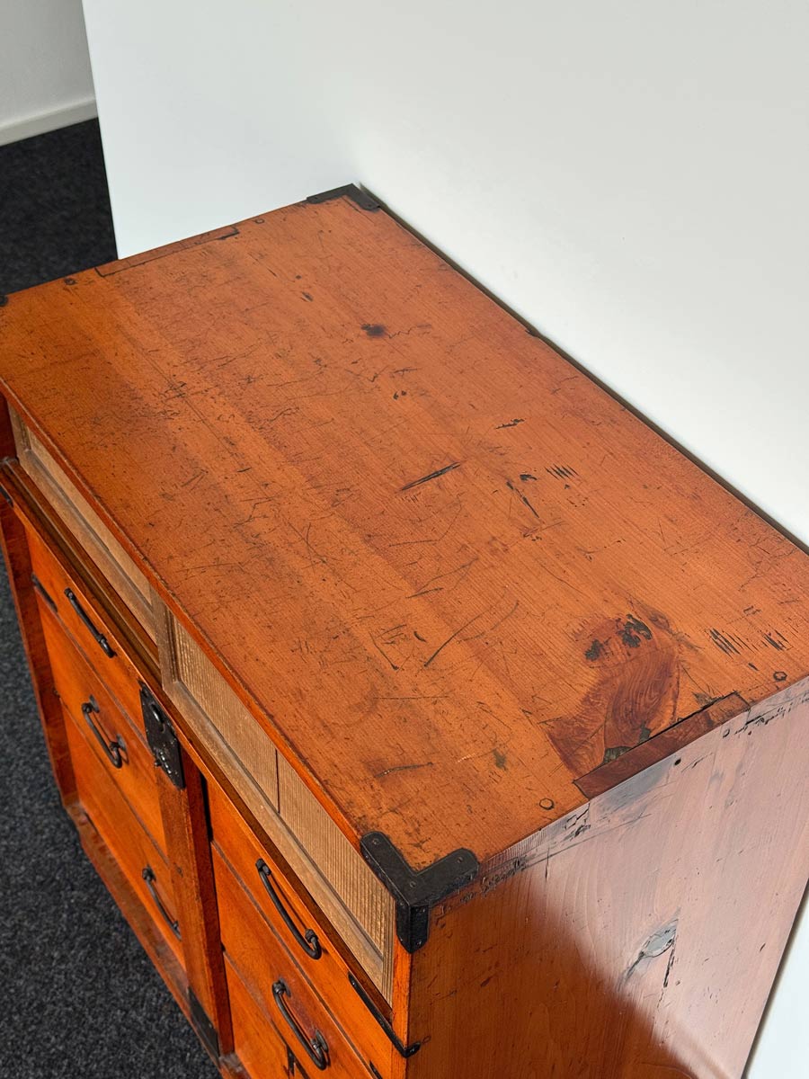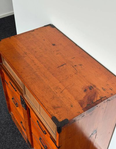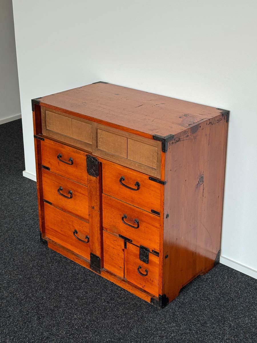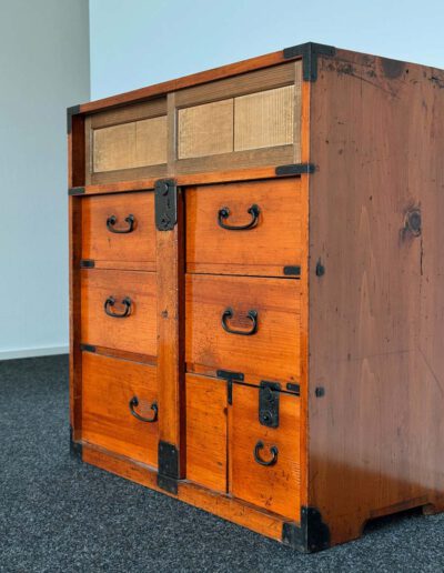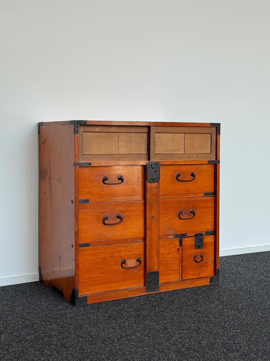 Dieser Tansu stammt aus dem späten 19. Jahrhundert. Sein kompakter Korpus ist klar proportioniert und streng gegliedert. Die Front zeigt eine ausgewogene Abfolge unterschiedlich großer Schubladen sowie ein kleines, verschließbares Fach. Die beiden oberen Schiebetüren sind im ursprünglichen Rohzustand belassen und setzen einen bewussten materiellen Kontrast zur gefassten Oberfläche des Korpus. Dessen Holz besitzt eine warme, durch Jahrzehnte gewachsene Oberfläche mit einem feinen Glanz von Urushi-Lack. Die Eisenbeschläge sind schlicht ausgeführt und von gleichmäßiger, dunkler Patina. Der Tansu hat sich in vollständig erhaltenem Zustand bewahrt, einschließlich des originalen vertikalen Riegels, der den unteren Bereich verschliesst und bei vergleichbaren Stücken häufig verloren ist.