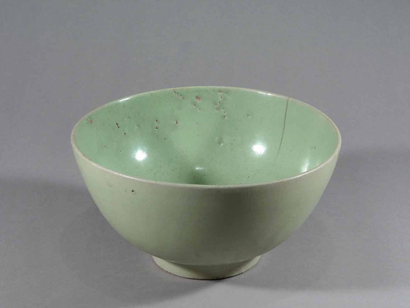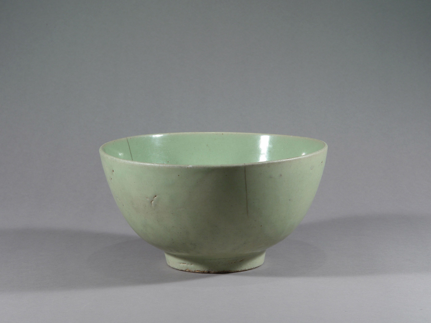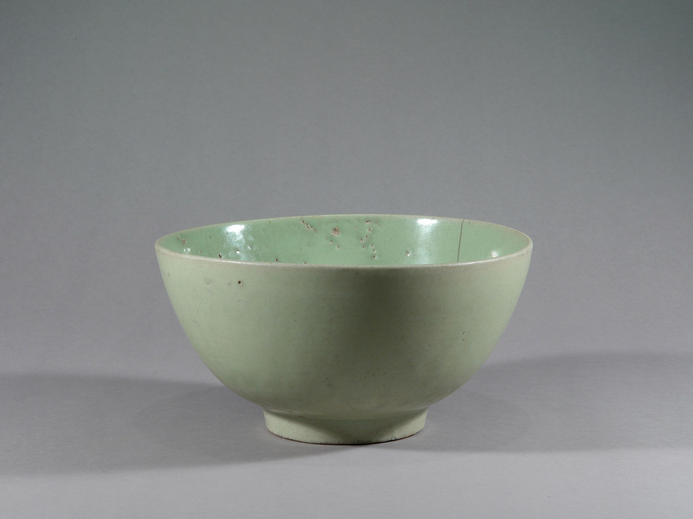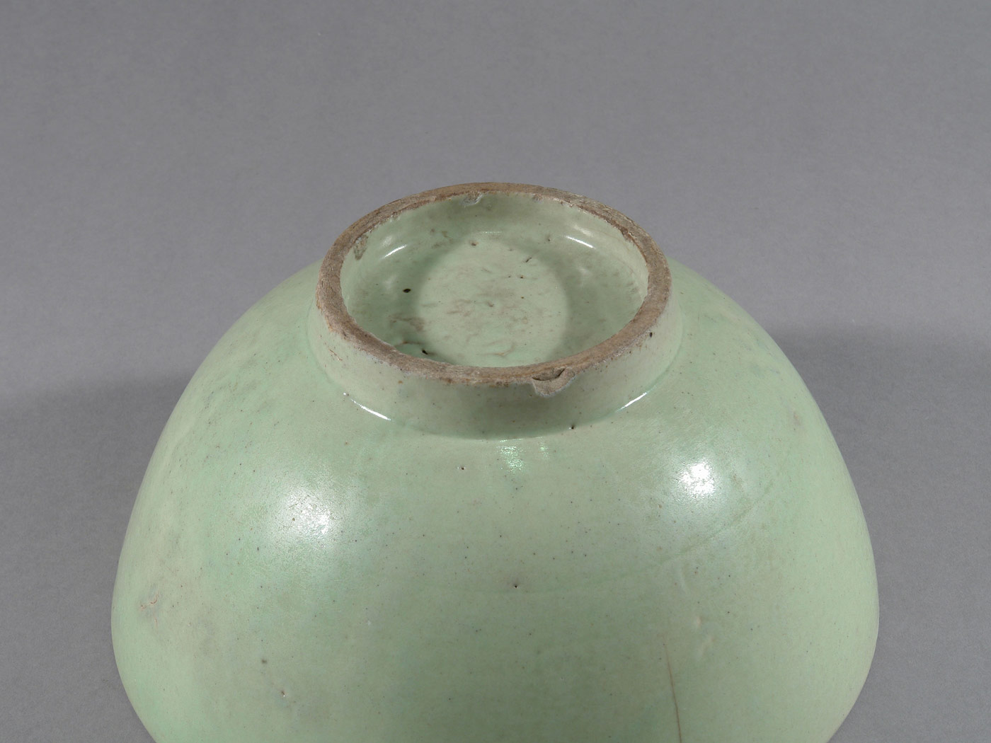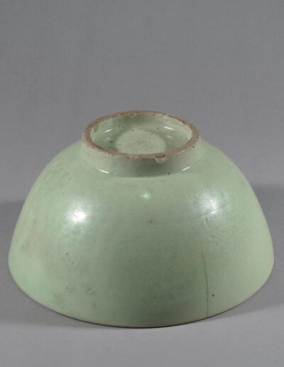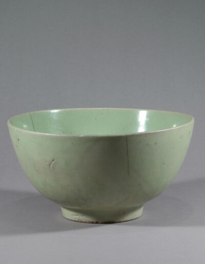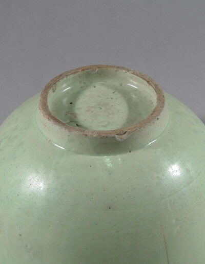 Im Unterschied zu den transluzideren, jadeähnlich leuchtenden Seladonen der Song-Zeit zeigen spätere Longquan-Glasuren eine subtilere, leicht trübende Kristallisation. Gerade in größeren Gefäßen entsteht dadurch ein harmonischer, beinahe gedämpfter Ton, der nicht von malerischen Effekten lebt, sondern von der stillen Tiefgründigkeit einer einzigen Farbe. Kleine Eisenpunkte auf Innen- und Außenwand sowie ein feiner Brennriss erzählen von den physikalischen Spannungen des Materials, ohne die Integrität des Gefäßes zu beeinträchtigen. In der japanischen Ästhetik späterer Jahrhunderte wurden solche Spuren nicht als Makel, sondern als stille Zeugnisse des Brennvorgangs betrachtet. Daher wurden gerade solche chinesischen Keramiken in Japan besonders geschätzt.