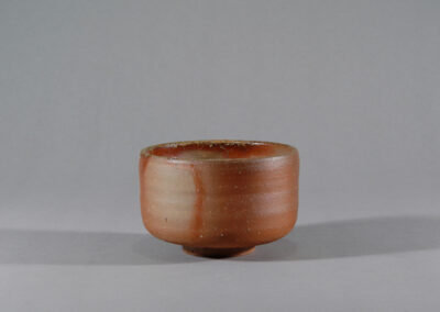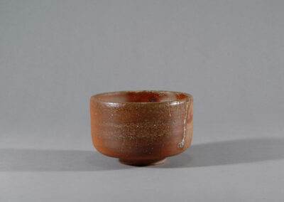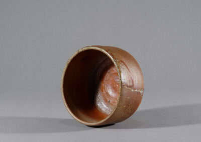 Diese Chawan wirkt zunächst zurückhaltend. Nichts an ihr sucht Aufmerksamkeit. Die Form ist ruhig und beinahe streng: eine zylindrische Wandung, ein klar gefasster Rand, ein kompakter Fuß. Alles erscheint selbstverständlich, beinahe nüchtern. Und doch entfaltet sich beim längeren Betrachten eine stille Spannung zwischen Form und Oberfläche.