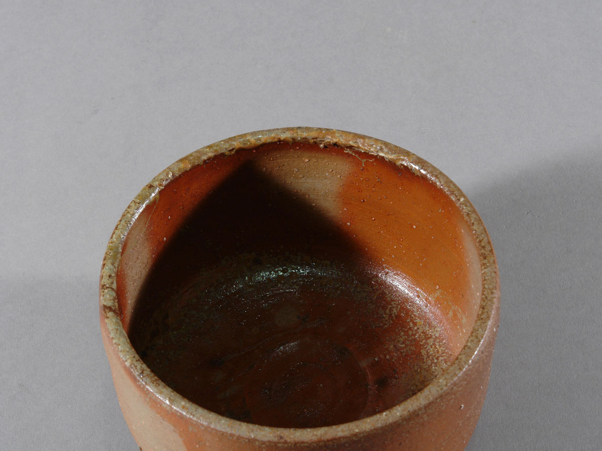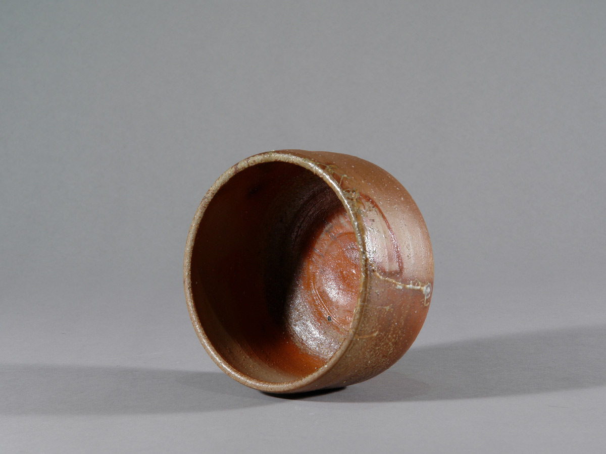 Der übrige Körper bleibt zurückhaltend. Feine Aschepunkte liegen über dem Ton, die Oberfläche wirkt trocken und lebendig zugleich. Innen verdichtet sich die Farbe zu einem dunkleren Rotbraun, als hätte das Feuer dort länger verweilt.