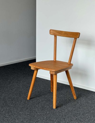Charakteristisch für den Entwurf sind die leicht ausgestellten konischen Beine, die klare, schnörkellose Sitzfläche sowie die sanft gebogene Rückenlehne. In ihrer Reduktion verbinden sich konstruktive Klarheit, Materialökonomie und eine selbstverständliche Gebrauchstauglichkeit.