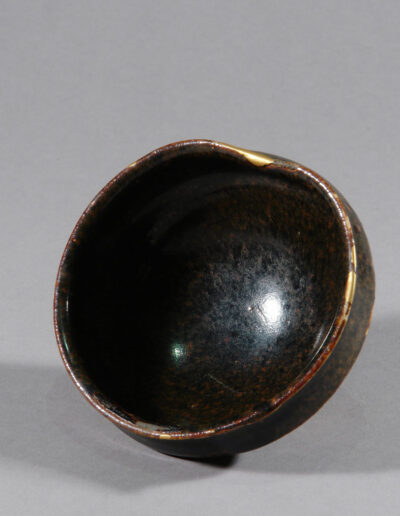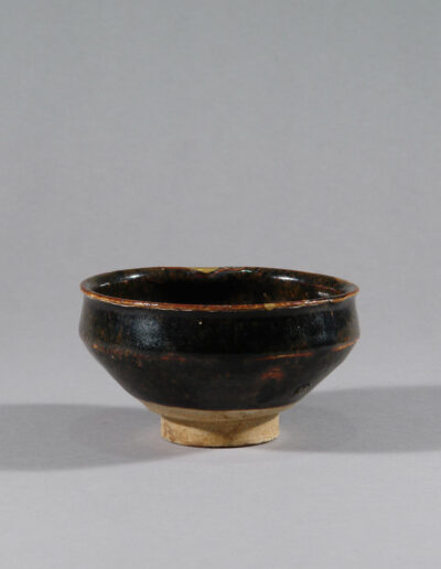 Diese kompakt proportionierte Tenmoku-Schale folgt der japanischen Adaption chinesischer Jian-Vorbilder, die in der Teezeremonie des späten 16. Jahrhunderts eine besondere Wertschätzung erfuhren. Der leicht ausladende Korpus ruht auf einem breiten, unglasierten Standring aus hellem, sandig wirkendem Steinzeugton. Die eisenreiche Glasur erscheint dunkelbraun bis schwarz mit unregelmäßig verteilten bräunlichen Einsprengseln und wolkigen Verläufen, die auf eine variierende Schmelzdichte im Hochbrand zurückgehen.