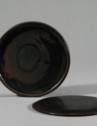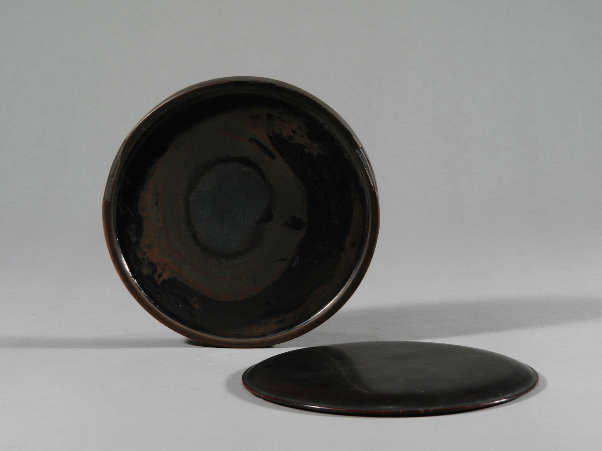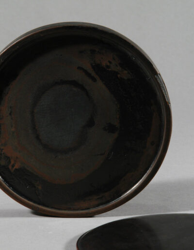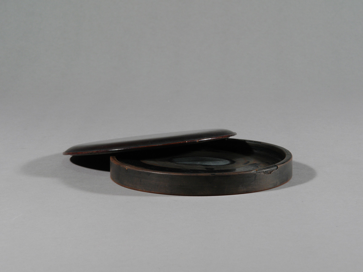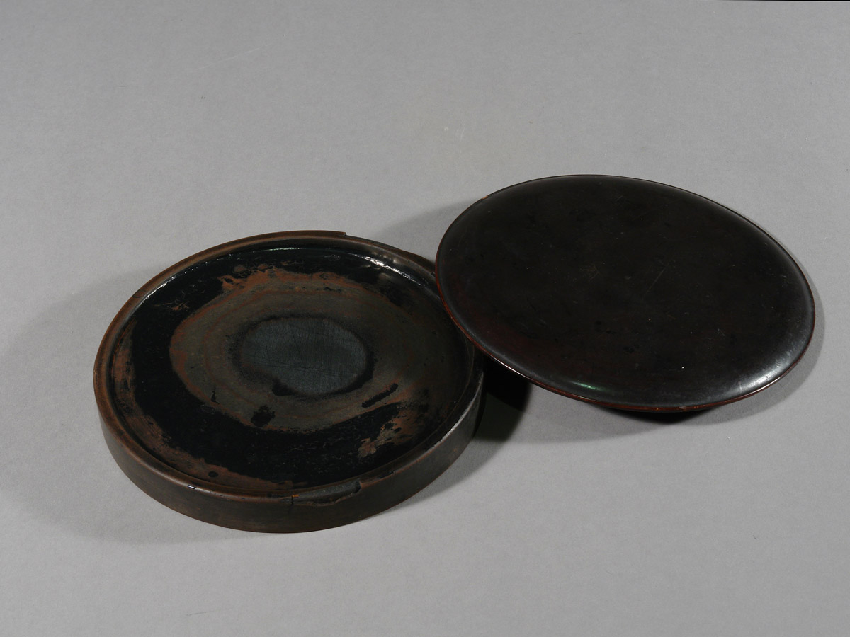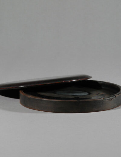 Dieses flache, kreisrunde Tuschegefäß wurde aus Holz gedrechselt und mit schwarzem Urushi-Lack überzogen. Die zurückhaltende Form verzichtet vollständig auf dekorative Elemente. Der leicht gewölbte Deckel folgt der ruhigen Kreislinie des Korpus und schließt passgenau auf dem flachen Gefäßkörper.
