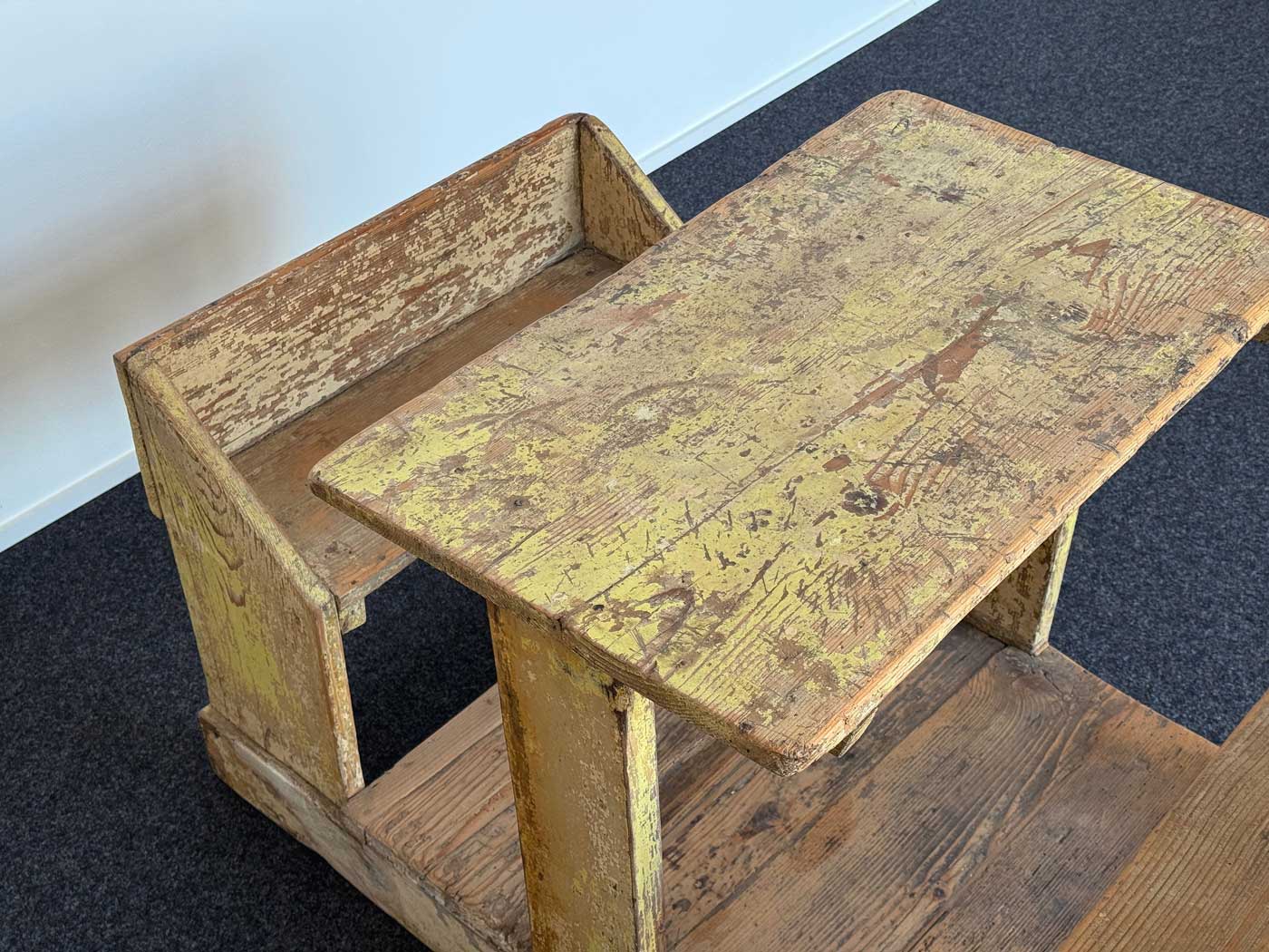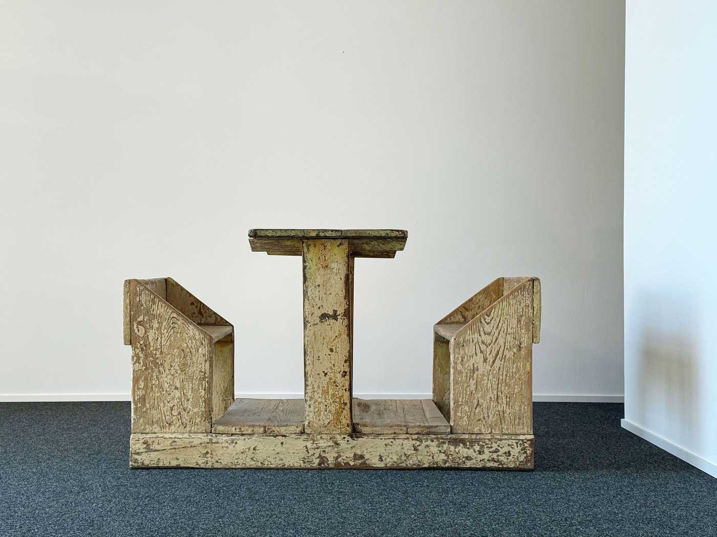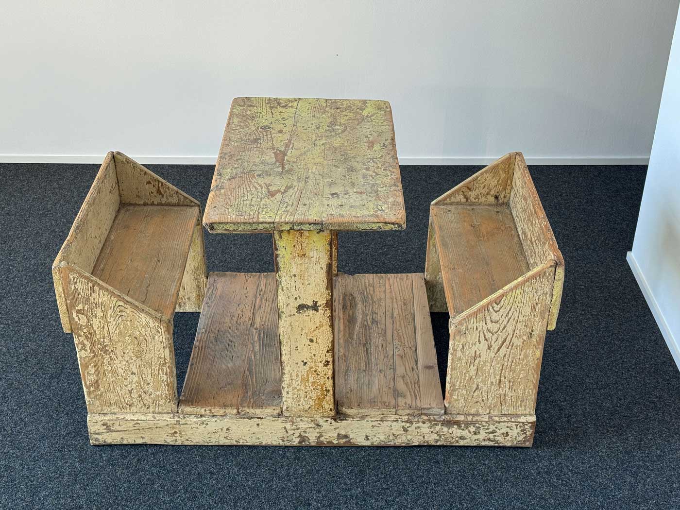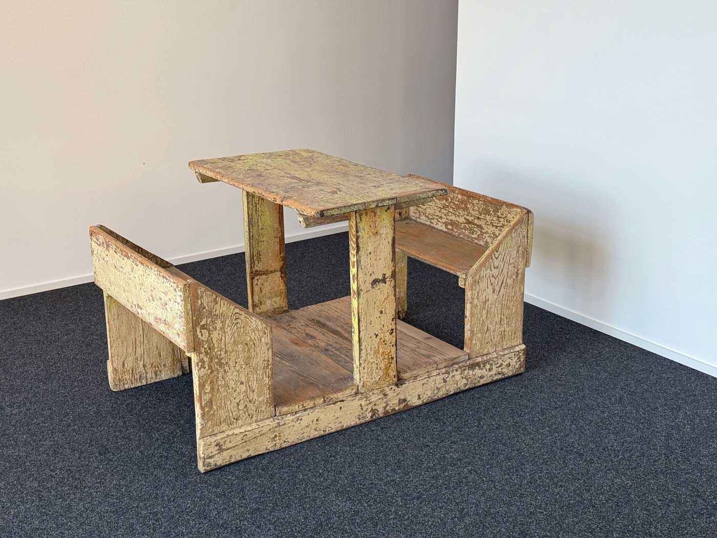 Diese seltene Kinderbank mit zentraler Tischfläche entstand um 1920 in den Niederlanden und wurde für zwei gegenüber sitzende Kinder konzipiert. Zwei einfache Sitzflächen sind durch eine gemeinsame Arbeits- und Spielplatte verbunden. Das Möbel besteht aus massivem Kiefernholz und folgt einer schlichten Konstruktion mit klaren Proportionen und ohne dekorative Details.