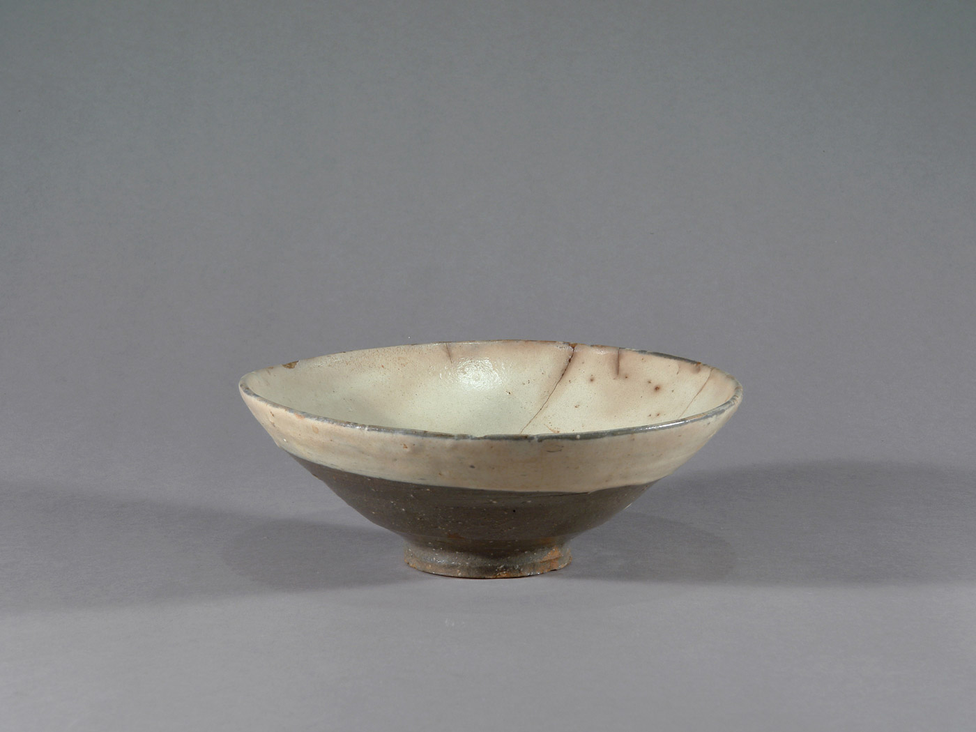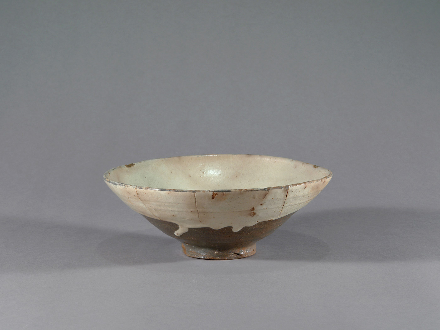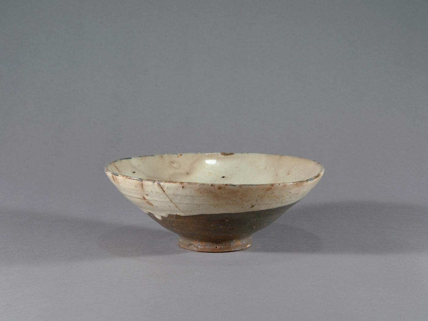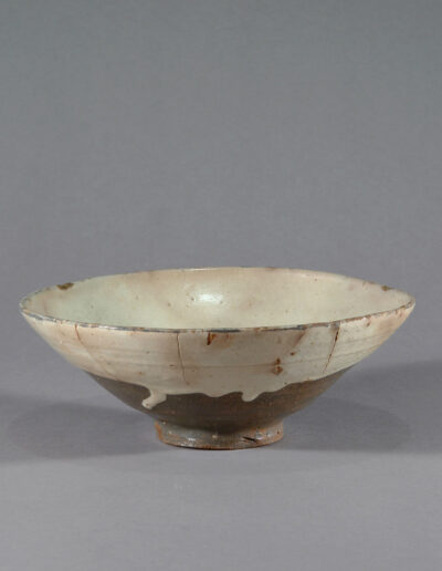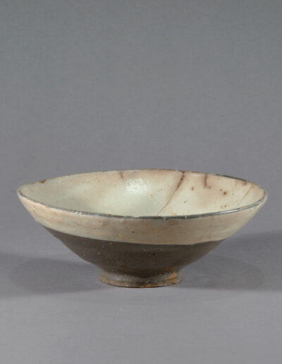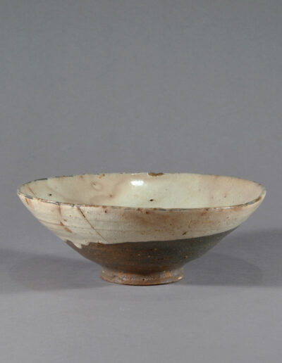 Diese koreanische Teeschale wird in das 16. oder frühe 17. Jahrhundert datiert. Sie besteht aus einem dunkel gebrannten, eisenhaltigen Scherben und ist innen sowie außen mit einer hellen, stellenweise leicht grünlich wirkenden Engobe überzogen.