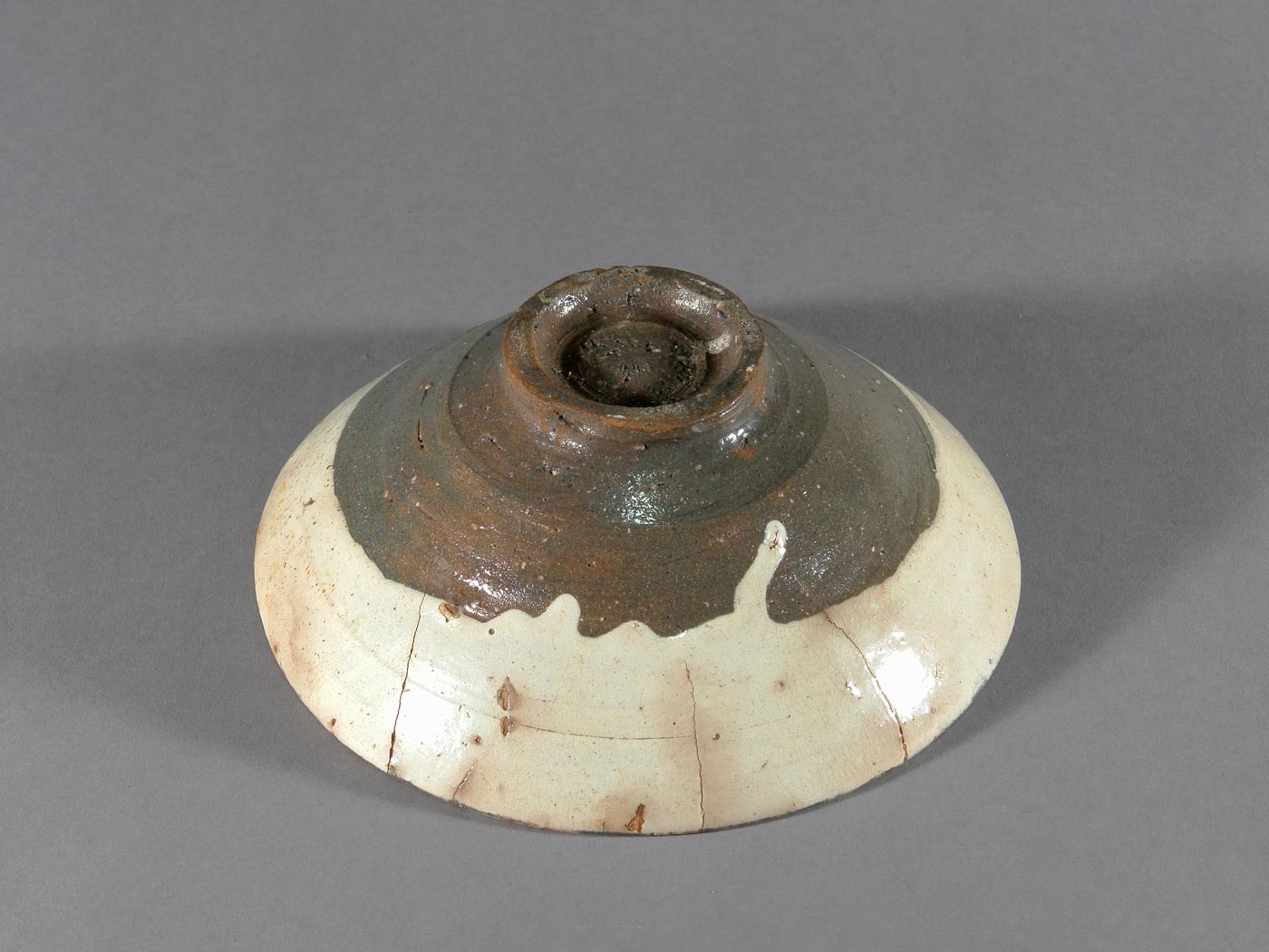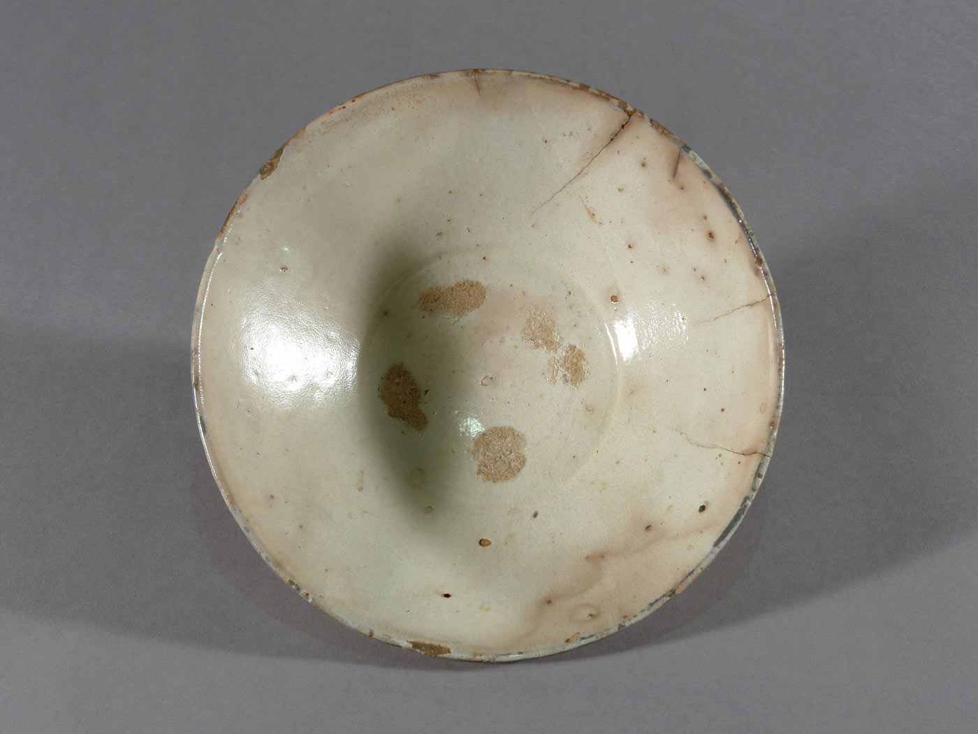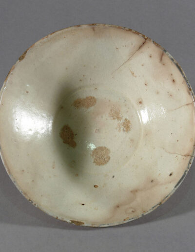 Die Form ist weit geöffnet und ruhig proportioniert. Im Inneren sind deutliche Brenn- sowie Alterungsspuren erkennbar, insbesondere Abdrücke von Brandstützen im Spiegel. Darüber hinaus finden sich Risse und kleinere Abplatzungen, die auf Gebrauch und Alterung zurückgehen und das heutige Erscheinungsbild der Schale mitprägen.