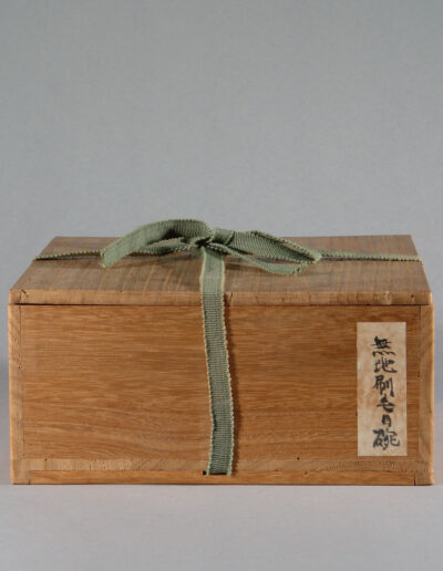 Die zugehörige Holzkiste trägt die Aufschrift muchi hakeme wan („schlichte Hakeme-Teeschale“), eine japanische Einordnung nach Erscheinung und Typus. Sie verweist auf die spätere Klassifizierung der Schale im japanischen Teekontext.