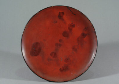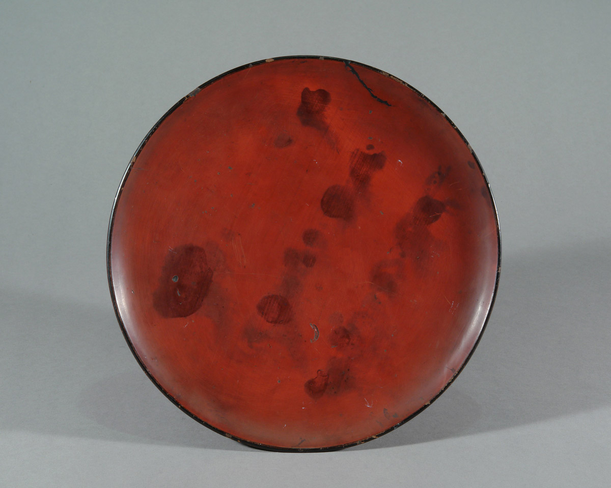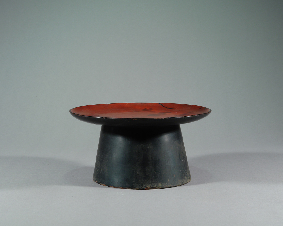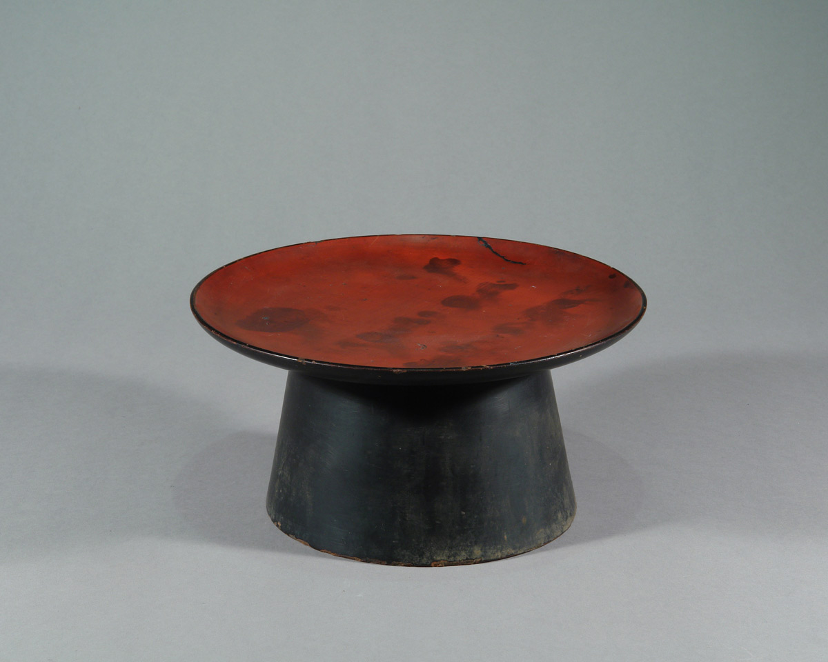 Ein breiter Teller auf konischem Fuß, in rotem und schwarzem Urushi lackiert. Die Oberfläche zeigt deutliche Nutzungsspuren; stellenweise ist die rote Deckschicht abgerieben und gibt den dunkleren Unterlack frei.