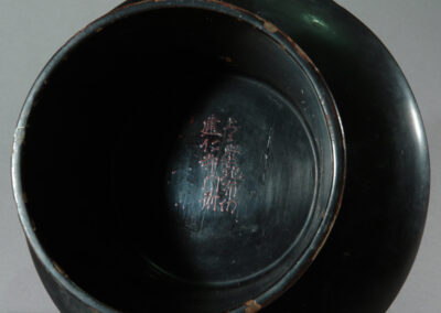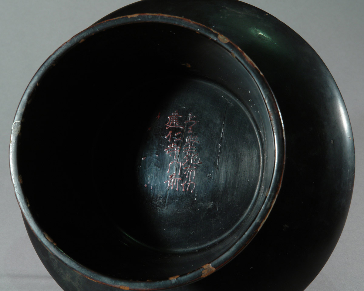 Im Inneren des Fußes befindet sich eine mit dem Pinsel aufgetragene Inschrift. Die Schrift ist in einer lockeren halbkursiven Form ausgeführt, wie sie für praktische Beschriftungen von Tempelinventar oder Stiftungen typisch ist. Stil und Pinselduktus sprechen für eine Entstehung um 1700. In der rechten Spalte ist sehr wahrscheinlich das Zeichen 寺 („Tempel“) zu erkennen, darüber vermutlich 仁; zusammen ergibt sich plausibel ein Hinweis auf 建仁寺 (Kennin-ji), einen bedeutenden Zen-Tempel in Kyoto. Die linke Spalte scheint eine kurze Widmungsformel zu enthalten, möglicherweise 真心 („aufrichtiges Herz“), wie sie bei religiösen Stiftungen vorkommt.