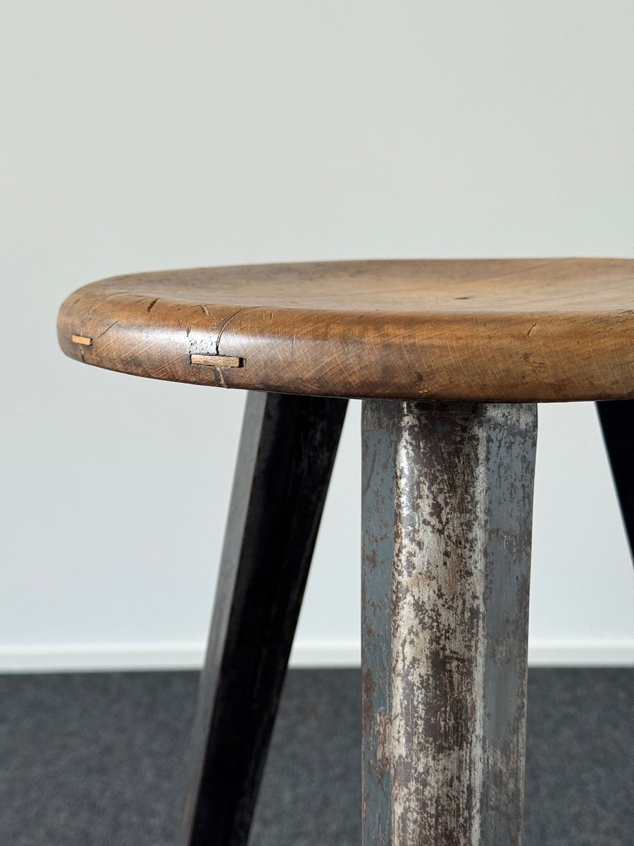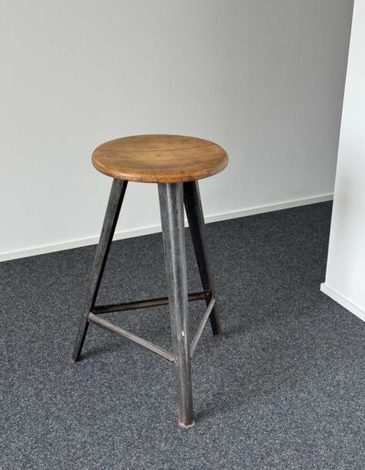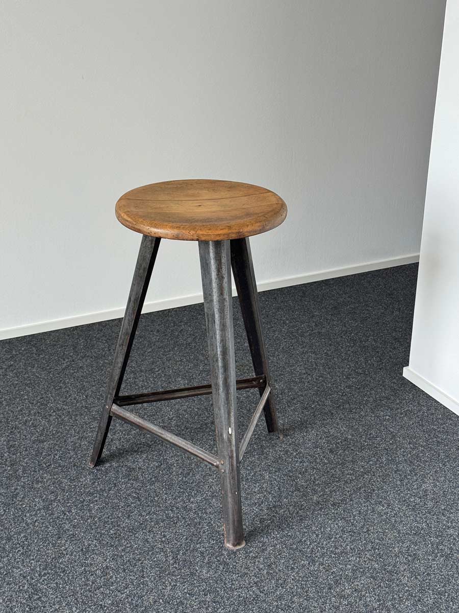 Dieser frühe Schemel aus der Produktion der Firma Rowac gehört zu den seltensten bekannten Ausführungen aus der Anfangszeit des Unternehmens. Die noch schmal profilierten Stahlbeine mit den nach außen umgebogenen Enden verweisen auf eine frühe konstruktive Phase, in der Stabilität und Materialstärke noch experimentell ausgelotet wurden. Diese Fußform wurde bald aufgegeben, da sie sich im Werkstattgebrauch als zu empfindlich erwies.