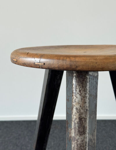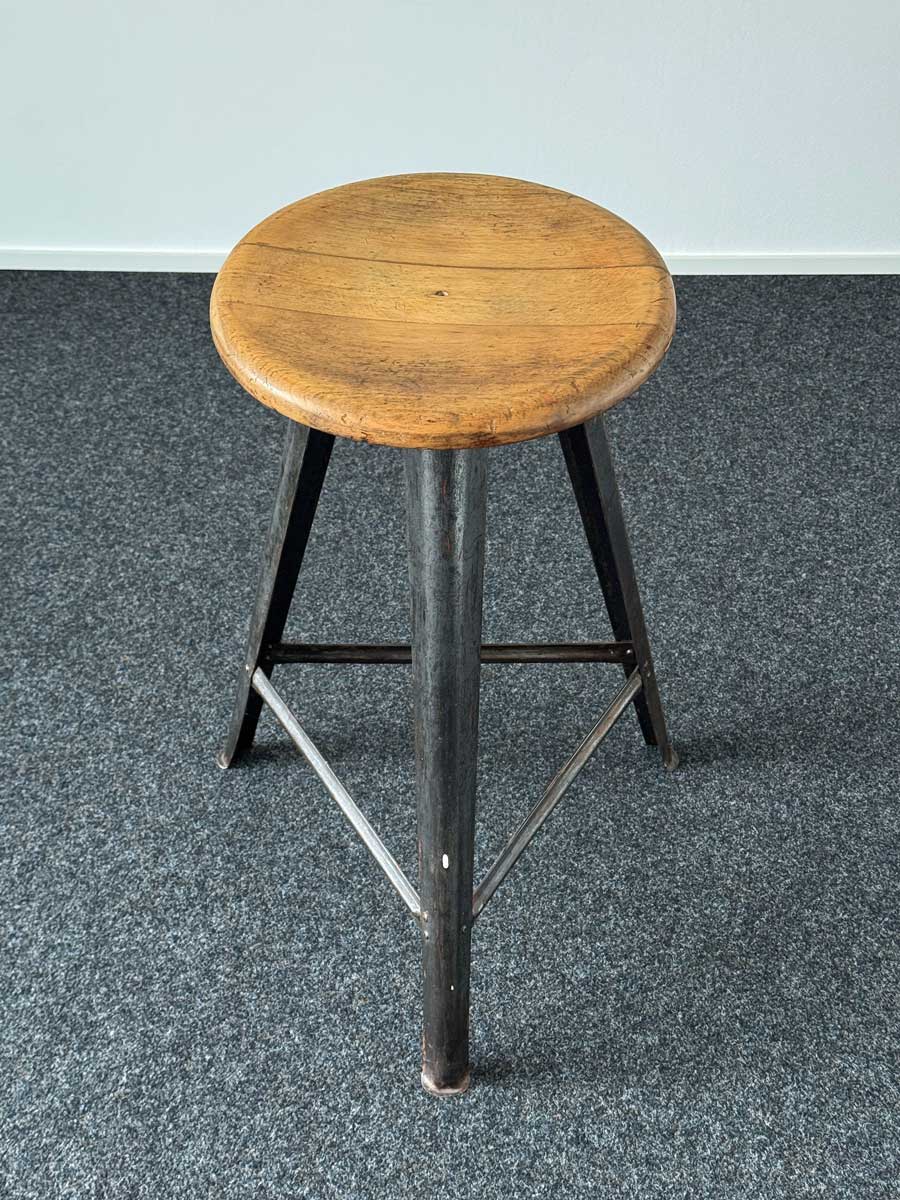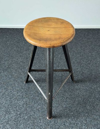 Mit seiner ungewöhnlichen Höhe von rund 65 cm und der klaren, fast archaischen Form vermittelt dieser Schemel noch die Anmutung eines Prototyps. Er steht am Beginn jener Entwicklung, in der sich aus handwerklicher Präzision und technischer Neugier die spätere industrielle Möbelproduktion von Rowac formte.
