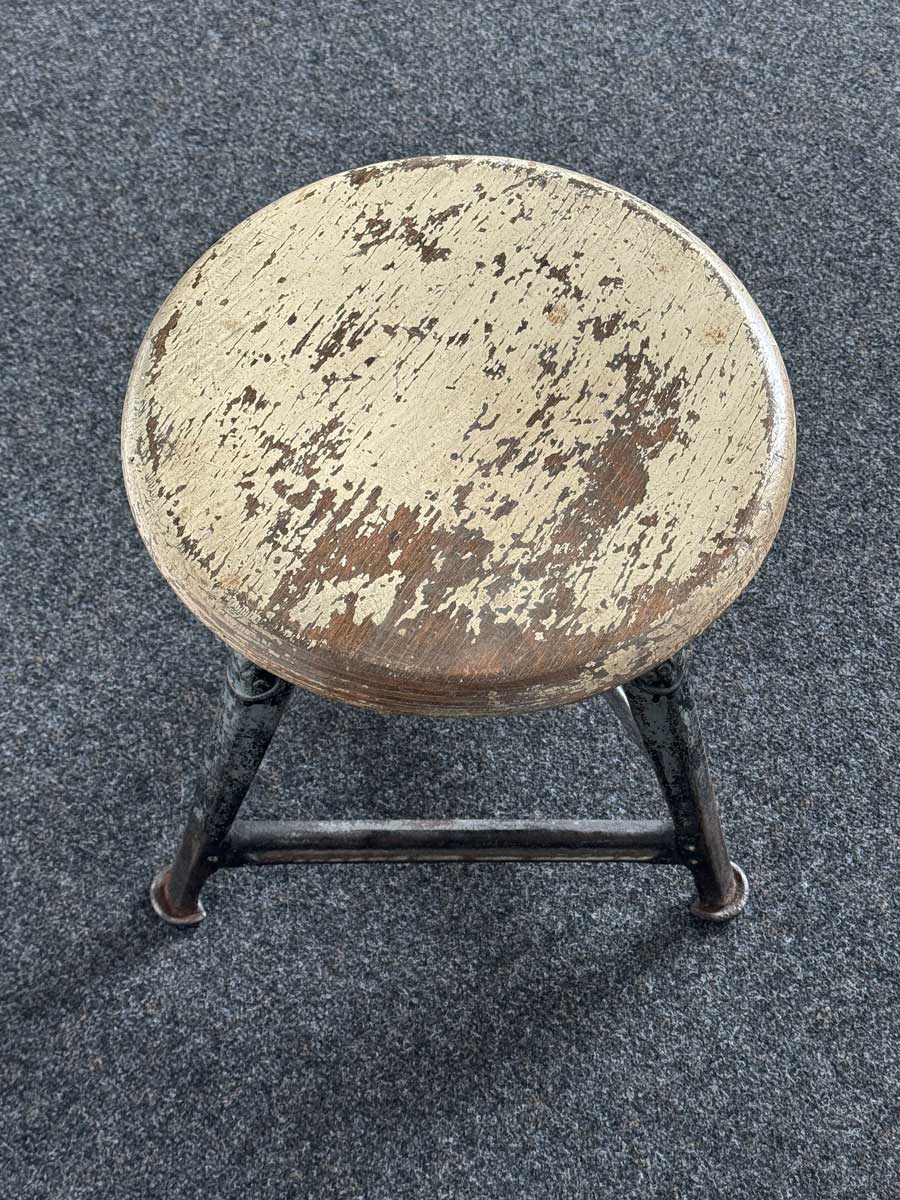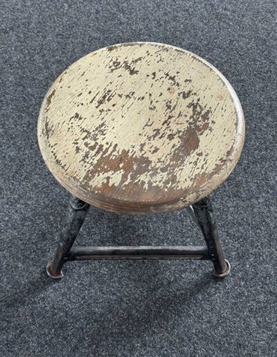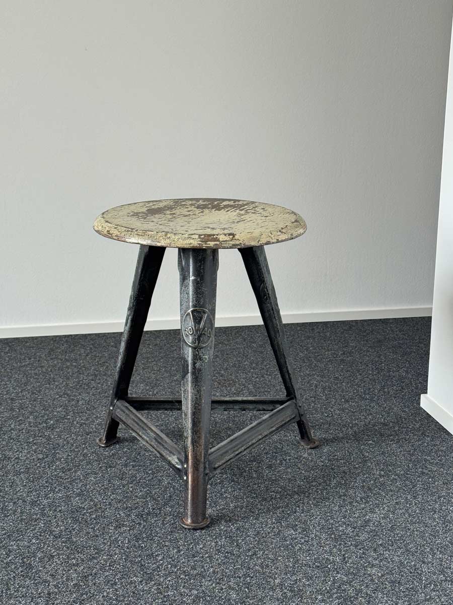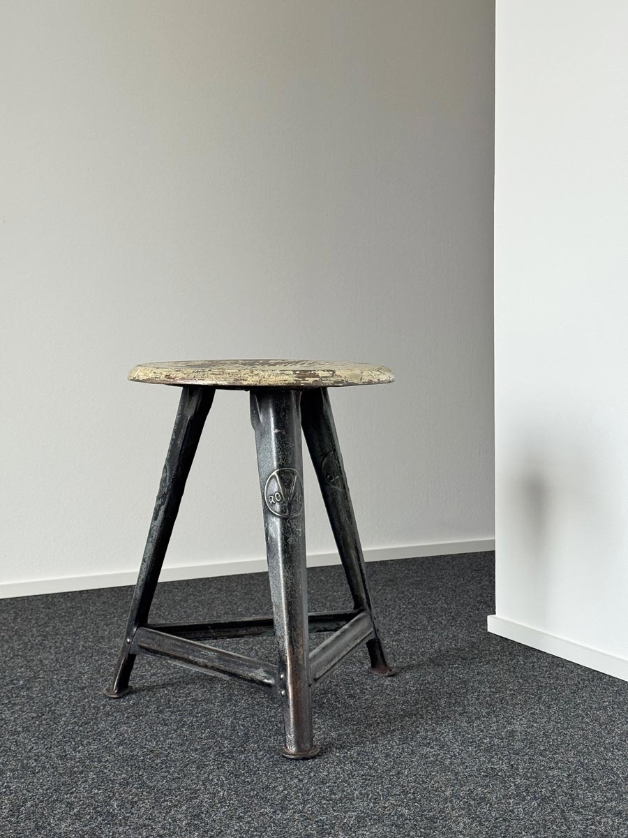 Dieser Schemel aus der klassischen Produktionsphase der Firma Rowac verbindet technische Präzision mit einer stillen, gealterten Schönheit. Das dreibeinige, vernietet ausgeführte Gestell aus profiliertem Stahlblech trägt an den Beinen die charakteristischen Firmenzeichen, deren erhabene Prägung die klare Konstruktion dezent akzentuiert.