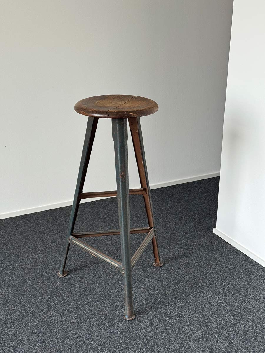 Mit einer Sitzhöhe von 85,5 cm gehört dieser Schemel zu den seltensten bekannten Exemplaren der Rowac-Schemel-Produktion. Seine außergewöhnliche Proportion verleiht ihm eine fast skulpturale Präsenz, die zugleich die funktionale Klarheit der Konstruktion betont. Das dreibeinige Gestell aus profiliertem Stahlblech zeigt die charakteristische Vernietung der Werkserzeugnisse, während die ungemarkte Ausführung auf eine frühe oder spezielle Fertigungsreihe hinweist.