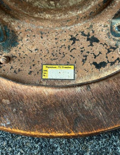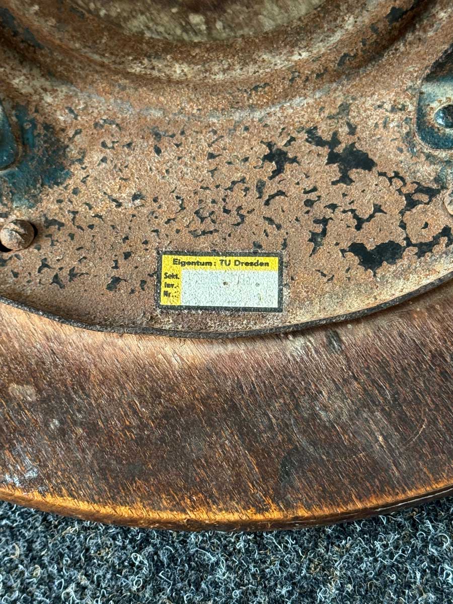 Die Sitzfläche aus massivem Holz bewahrt eine wunderbar gewachsene Patina mit feinen Gebrauchsspuren und tiefem, warmem Ton. Unterseitig findet sich ein Etikett mit der Provenienz „Eigentum: TU Dresden“ – ein seltener Hinweis auf den institutionellen Einsatz dieses Modells in akademischem oder technischen Umfeld.