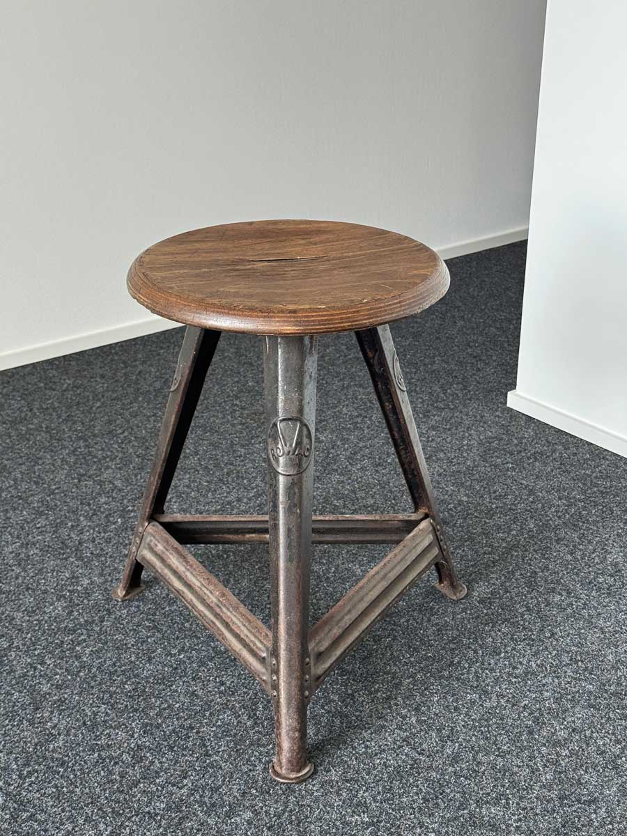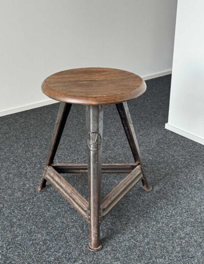 Der dreibeinige Schwerlasthocker zeigt eine der robustesten Ausführungen aus der Produktion der Firma Rowac. Sein Gestell aus stark profiliertem Stahlblech ist sorgfältig vernietet und durch eine dreieckige Verstrebung stabilisiert. Auf jedem Bein befindet sich das eingeprägte Firmenzeichen, dessen plastische Prägung die technische Präzision der Fertigung unterstreicht.