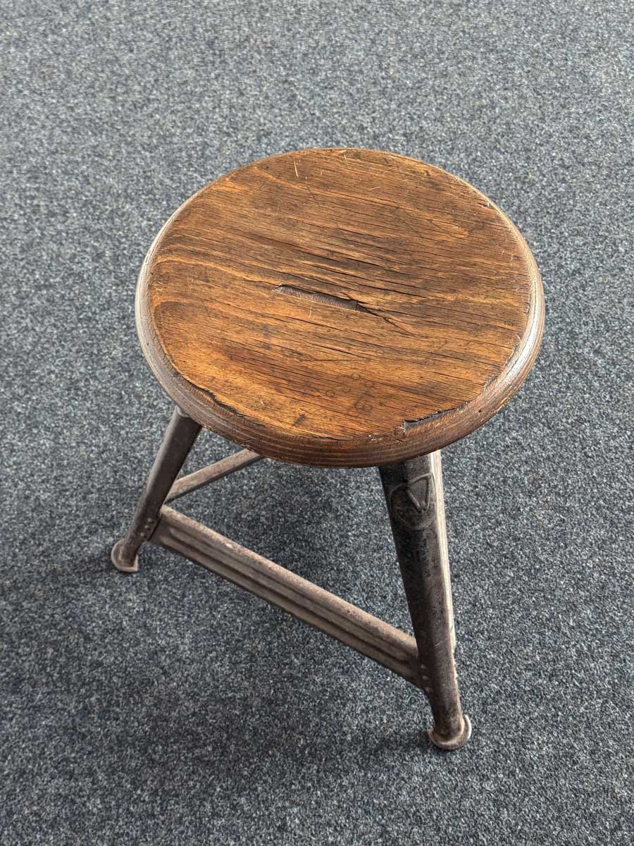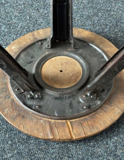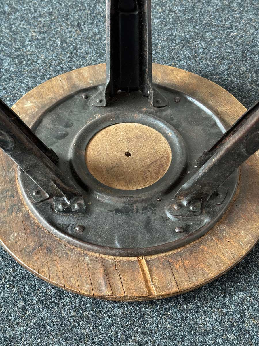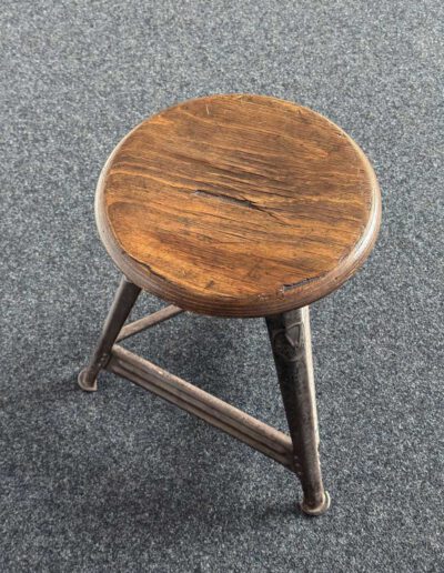 Die runde Sitzfläche aus massivem Holz ruht auf einer kreisförmigen Stahlplatte, die die Beine aufnimmt und zugleich die Verbindung zwischen organischem und industriellem Material bildet. Oberfläche und Kanten tragen Spuren intensiver Nutzung – feine Risse, Druckstellen und ein matter Glanz, der über Jahrzehnte entstanden ist.