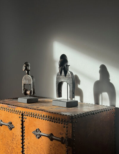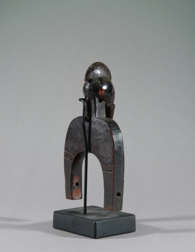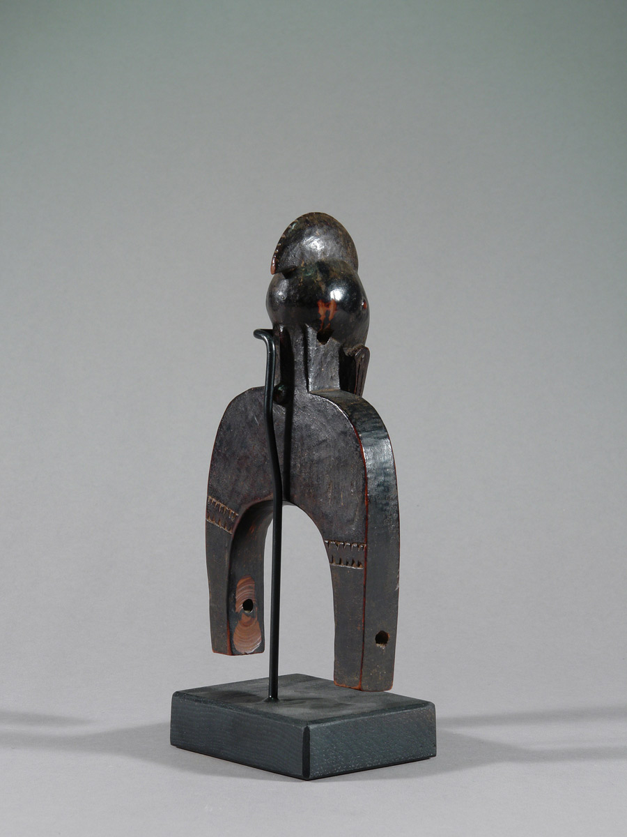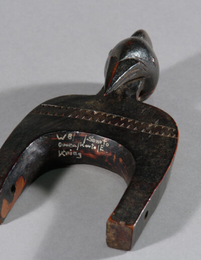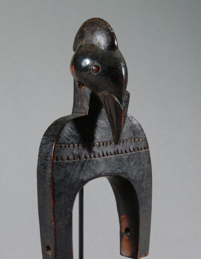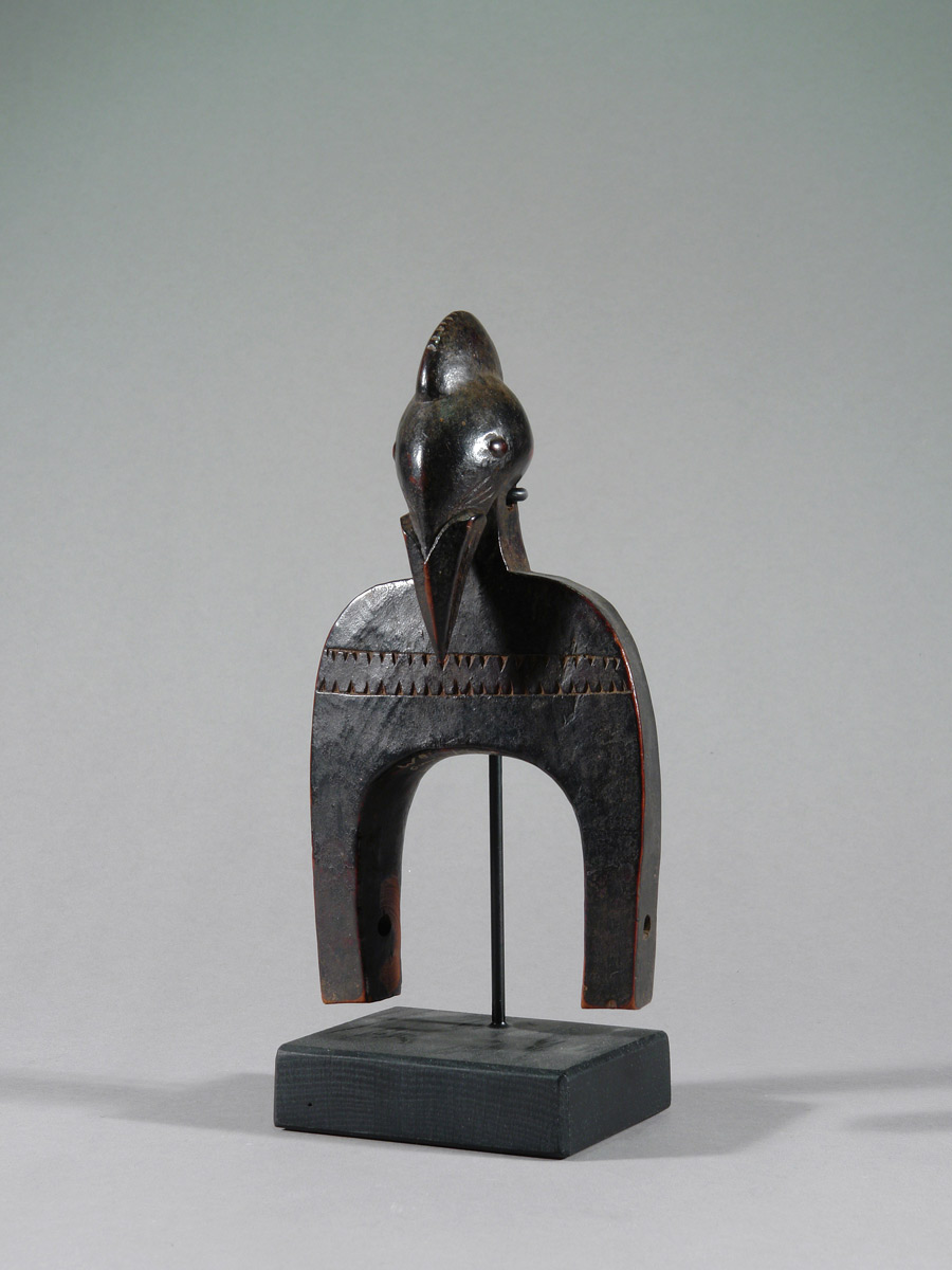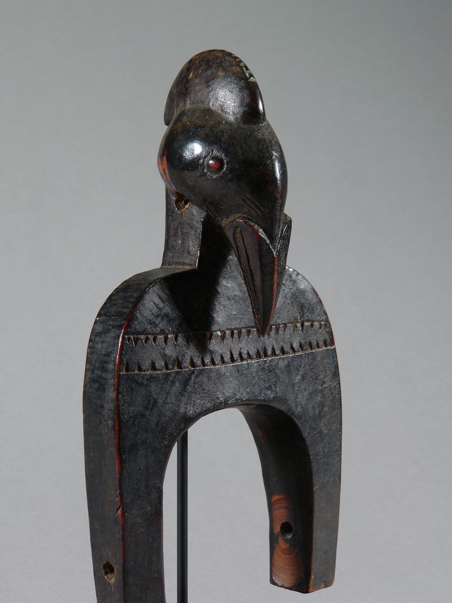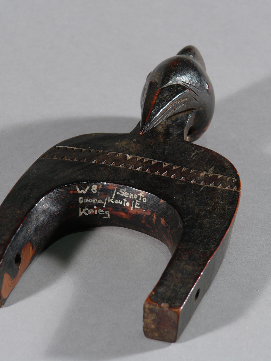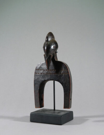 Dieser Webrollenhalter der Senufo ist als stark abstrahierte Vogelfigur gestaltet. Der kompakte, bogenförmig geöffnete Körper bildet die funktionale Aufnahme der Webrolle, während der plastisch ausgearbeitete Kopf mit langem Schnabel und leicht erhöhter Scheitelpartie die Figur deutlich hervorhebt. Eine Reihe eingeschnittener Dreiecksmotive gliedert die Vorderseite des Rumpfes und setzt einen rhythmischen, geometrischen Akzent.