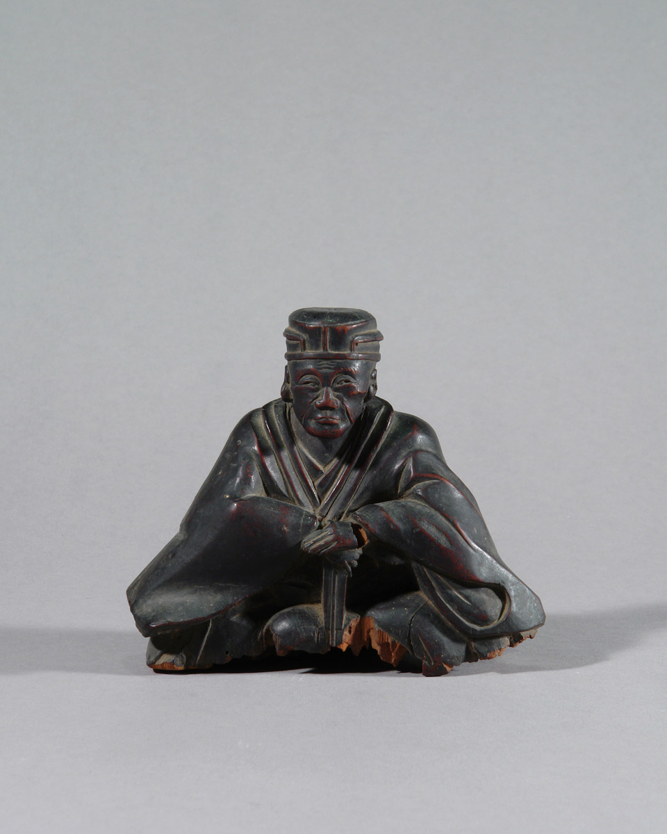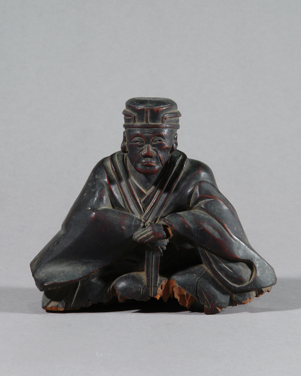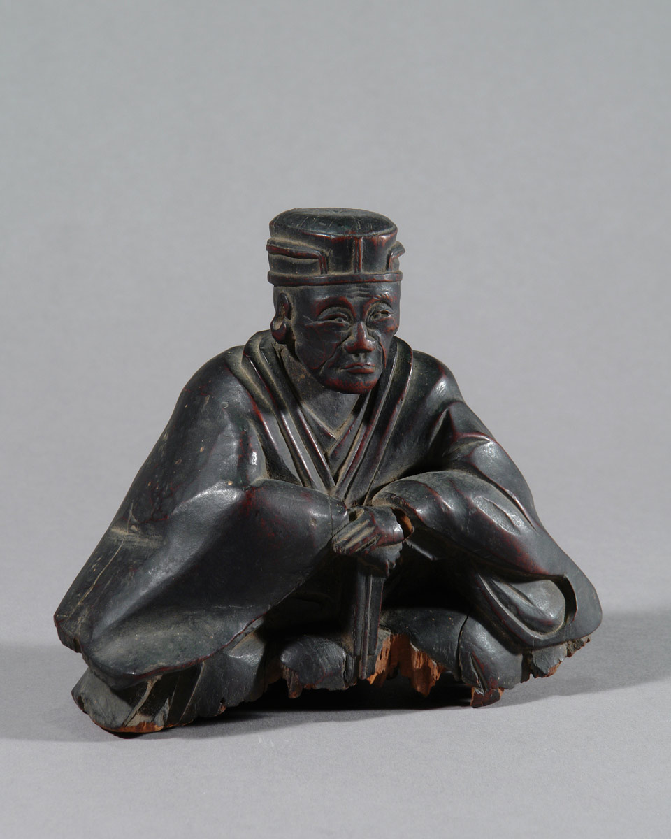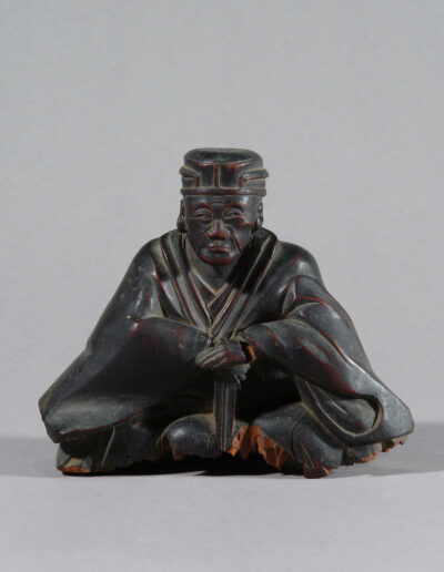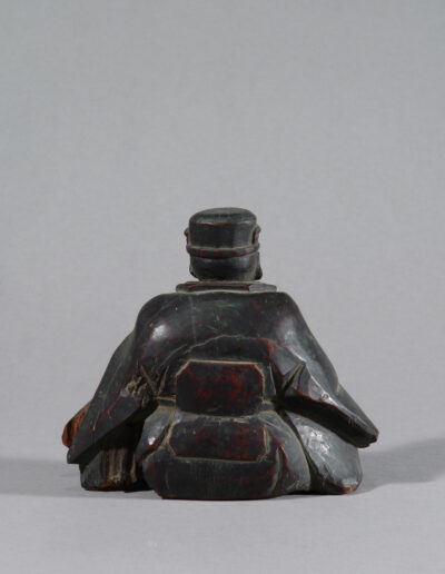 Es handelt sich nicht um ein zeitgenössisches Porträt. Bildnisse Sen no Rikyūs entstehen erst lange nach seinem Tod, als seine Lehre bereits gefestigt und institutionell verankert war. Besonders im Verlauf der Edo-Zeit entwickelte sich ein festes ikonographisches Schema, das ihn weniger als historische Person denn als geistige Autorität zeigt. Die vorliegende Skulptur steht klar in dieser Tradition.