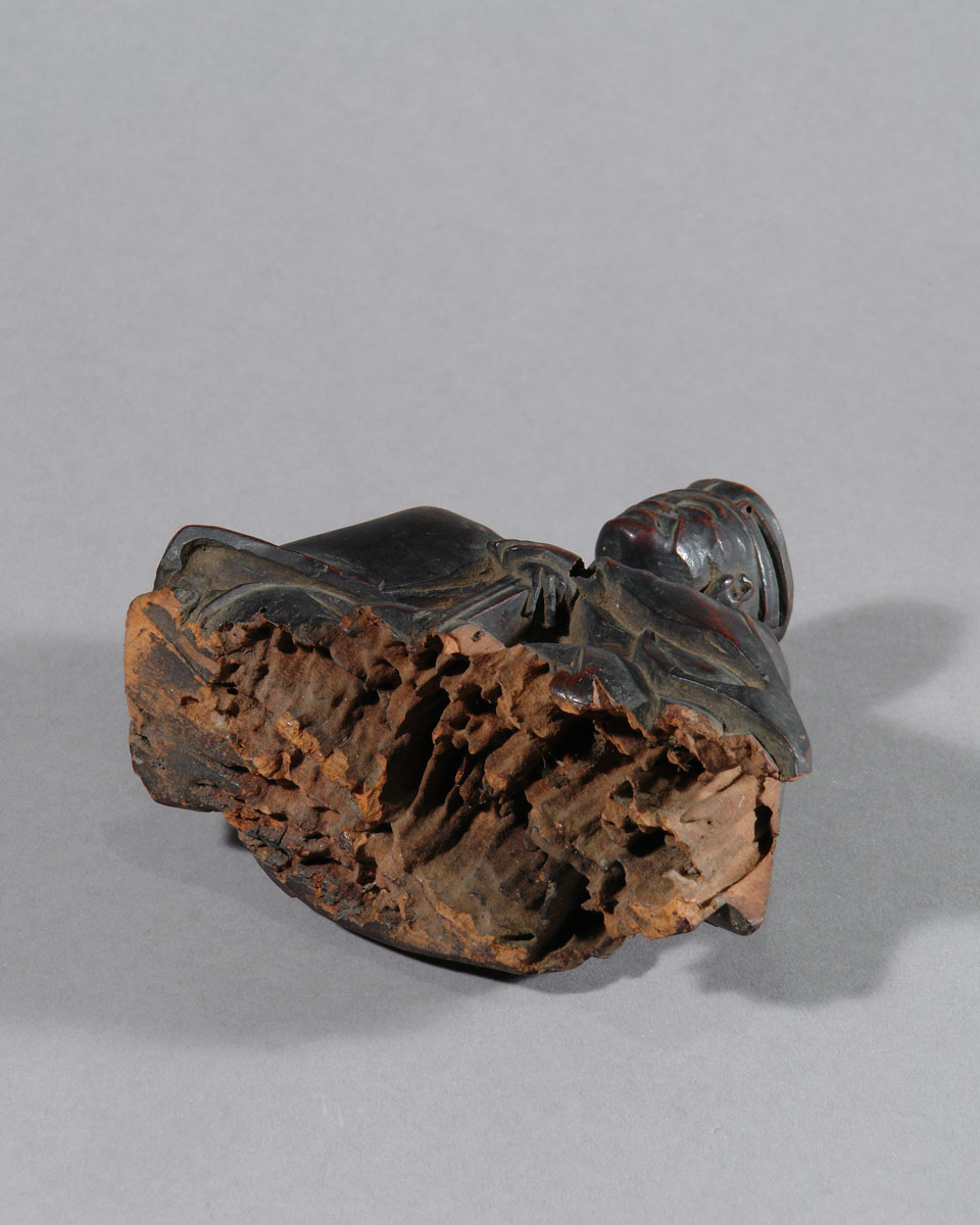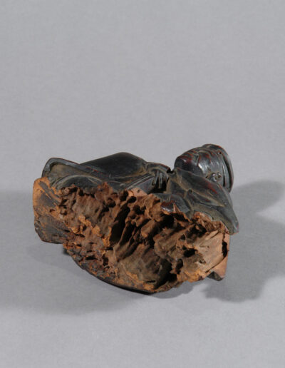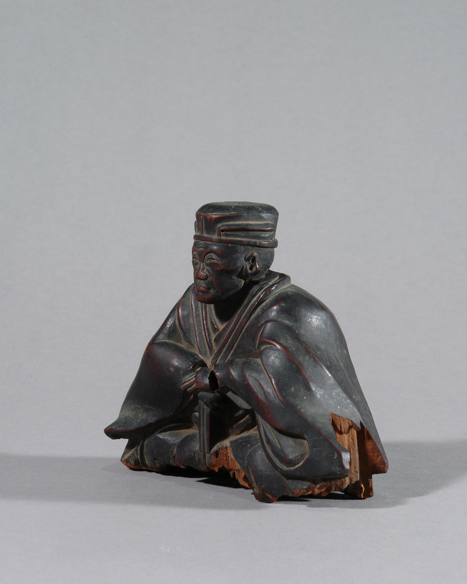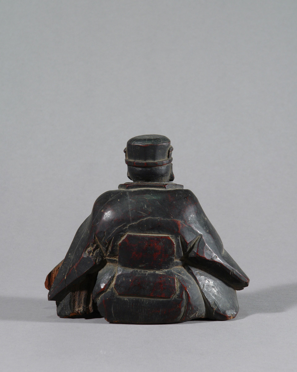 Es handelt sich nicht um ein zeitgenössisches Porträt. Bildnisse Sen no Rikyūs entstehen erst lange nach seinem Tod, als seine Lehre bereits gefestigt und institutionell verankert war. Besonders im Verlauf der Edo-Zeit entwickelte sich ein festes ikonographisches Schema, das ihn weniger als historische Person denn als geistige Autorität zeigt. Die vorliegende Skulptur steht klar in dieser Tradition.