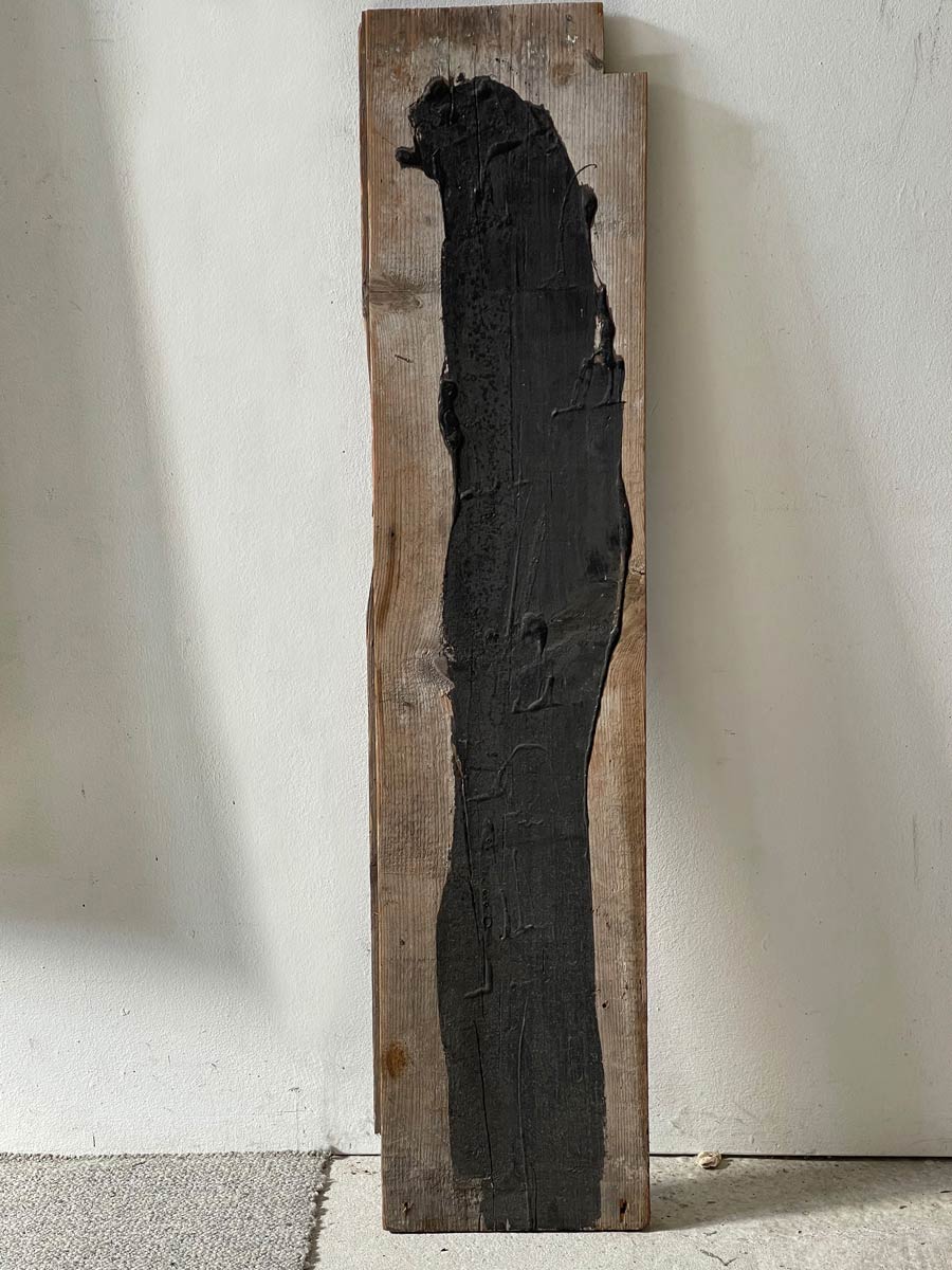 Thomas Baumhekel greift diesen Begriff auf und verwandelt ihn in eine poetische Metapher. Auf einem groben Brett zieht sich eine dunkle, vertikale Form empor, wie ein einziger konzentrierter Strich. Nicht geschrieben mit der Hand, sondern mit dem Körper: die Farbe wird von unten nach oben geschoben, in stiller Anspannung und größter Konzentration.