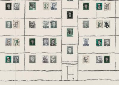Doch das nüchterne Raster wird gebrochen. Anstelle von Fenstern erscheinen Briefmarken der DDR, zwischen 1973 und 1990 ausgegeben, gestempelt und zirkuliert. Sie zeigen das offizielle Pantheon: Politiker, Wissenschaftler, Künstler – eine staatlich festgeschriebene Galerie von Leitfiguren. Persönliche Erinnerung, intime Spuren, Individualität haben in diesem System ebenso wenig Platz wie im anonymen Plattenbau, der keinen Dachboden kennt.