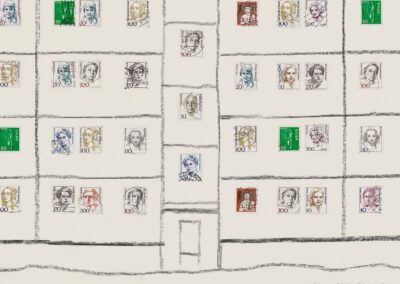 Doch das nüchterne Raster wird gebrochen. Anstelle von Fenstern erscheinen Briefmarken der DDR, zwischen 1973 und 1990 ausgegeben, gestempelt und zirkuliert. Sie zeigen das offizielle Pantheon: Politiker, Wissenschaftler, Künstler – eine staatlich festgeschriebene Galerie von Leitfiguren. Persönliche Erinnerung, intime Spuren, Individualität haben in diesem System ebenso wenig Platz wie im anonymen Plattenbau, der keinen Dachboden kennt.