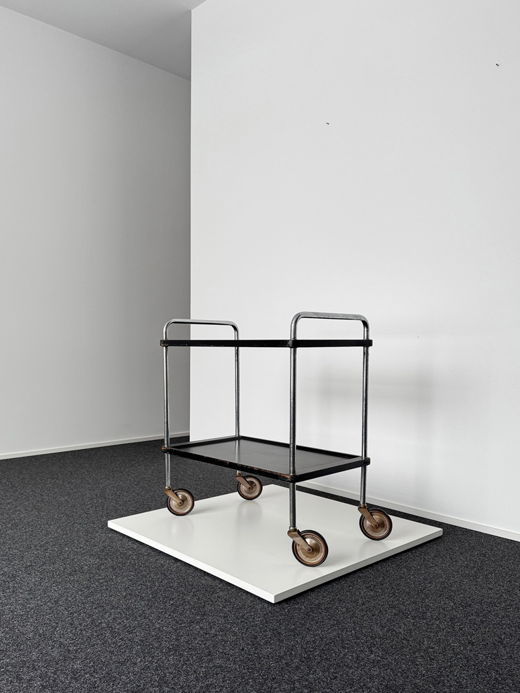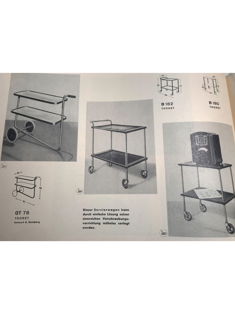 Der Servierwagen B 182 gehört zum Programm der zerlegbaren Thonet-Stahlrohrmöbel, wie es im Katalog von 1935 dokumentiert ist. Konstruktion und Proportionen entsprechen dem dort abgebildeten Modell.