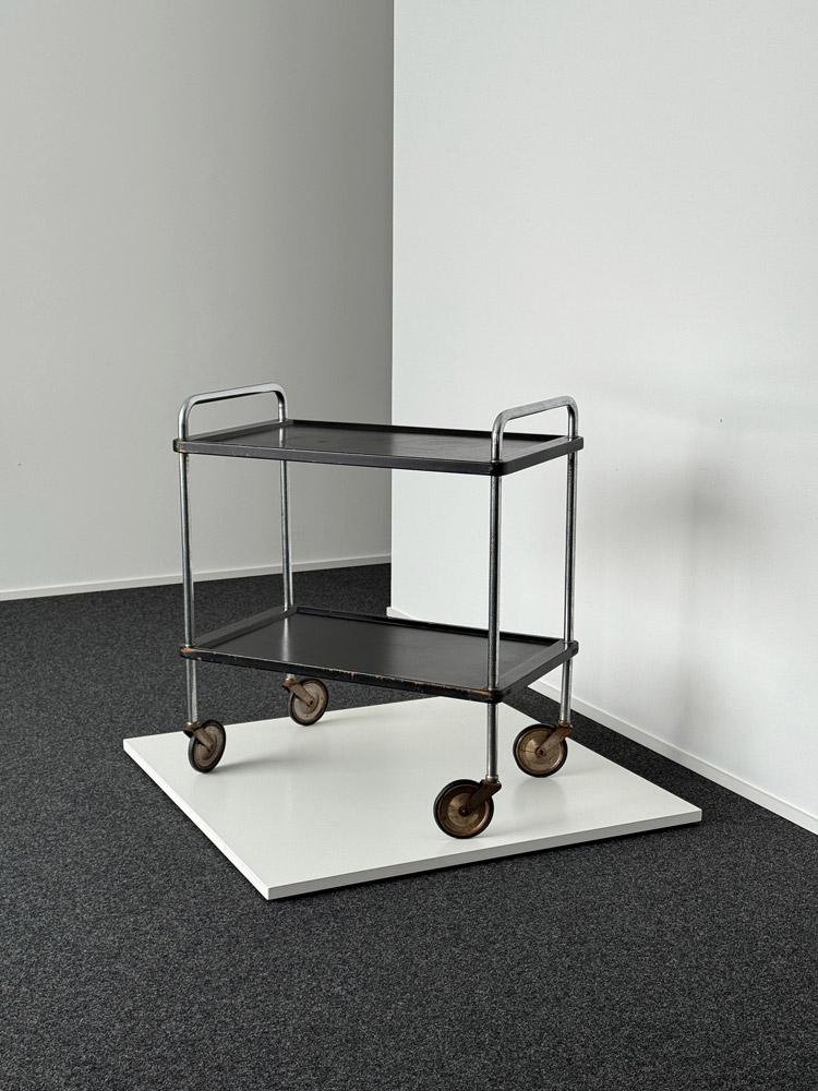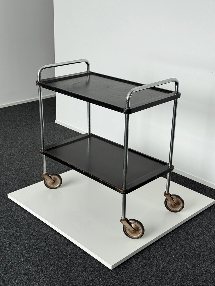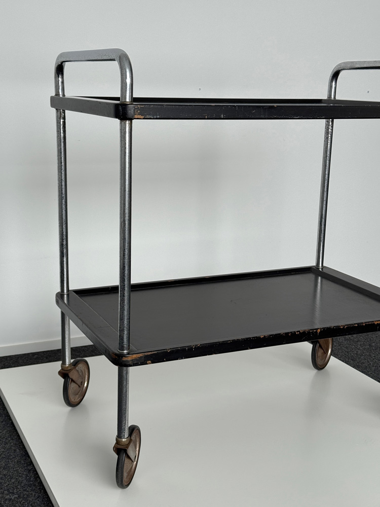 Die klare rechteckige Gliederung und die reduzierte Materialkombination aus schwarzem Holz und verchromtem Stahlrohr entsprechen dem funktionalen Gestaltungsverständnis der frühen 1930er Jahre.