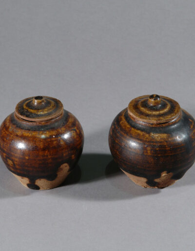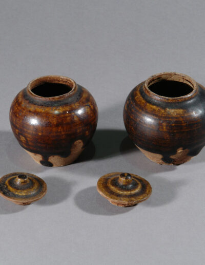 Diese beiden kompakten Deckelgefäße repräsentieren ein charakteristisches Beispiel frühneuzeitlicher chinesischer Keramikproduktion. Ihre klar strukturierte, bauchige Form mit leicht eingezogenem Standring wirkt ausgewogen und handwerklich sorgfältig ausgeführt. Die helle, fein geschlämmte Scherbe weist auf einen gut aufbereiteten, regionaltypischen Ton hin.