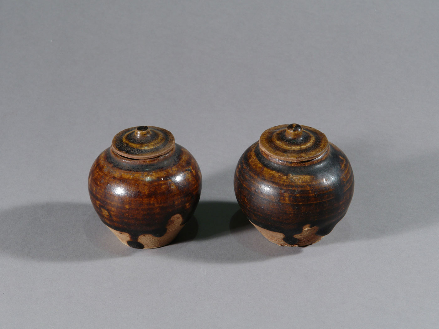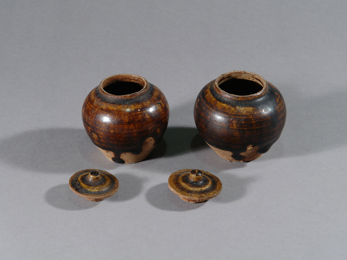 Die separat gefertigten Deckel entsprechen der funktionalen Ausrichtung solcher Kleinbehälter. Mit ihren konzentrischen Drehrillen und kleinen Knäufen sind sie technisch präzise und zweckmäßig gestaltet und greifen flach in die Öffnung ein. Gefäße dieser Art wurden im häuslichen Alltag üblicherweise zur Aufbewahrung kleiner Mengen von Gewürzen, medizinischen Zutaten oder anderen trockenen Substanzen verwendet.